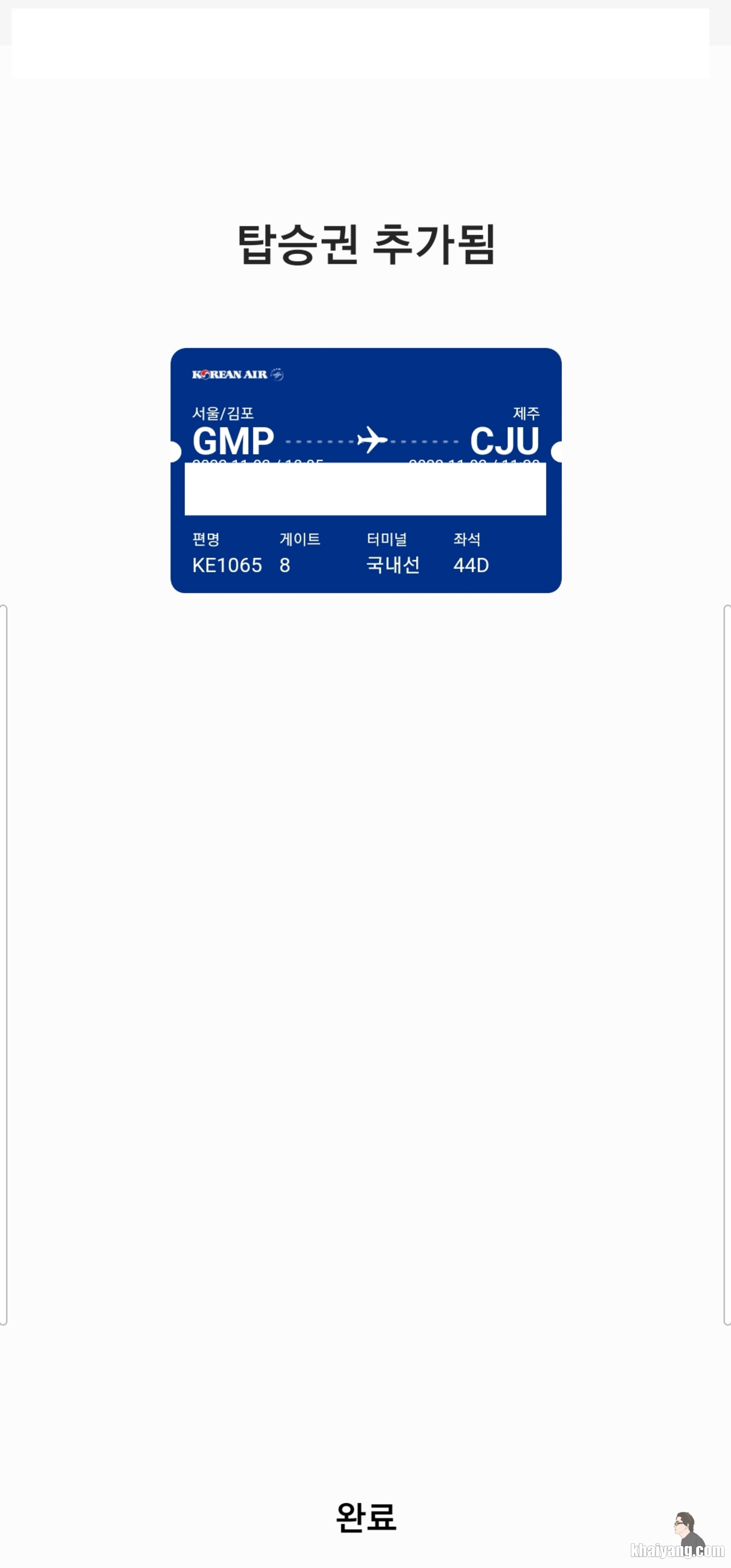 대한항공 탑승권을 사셨을 경우 대한항공 앱을 통해 체크인을 하는 경우 마지막에 이 화면을 만날 수 있습니다.