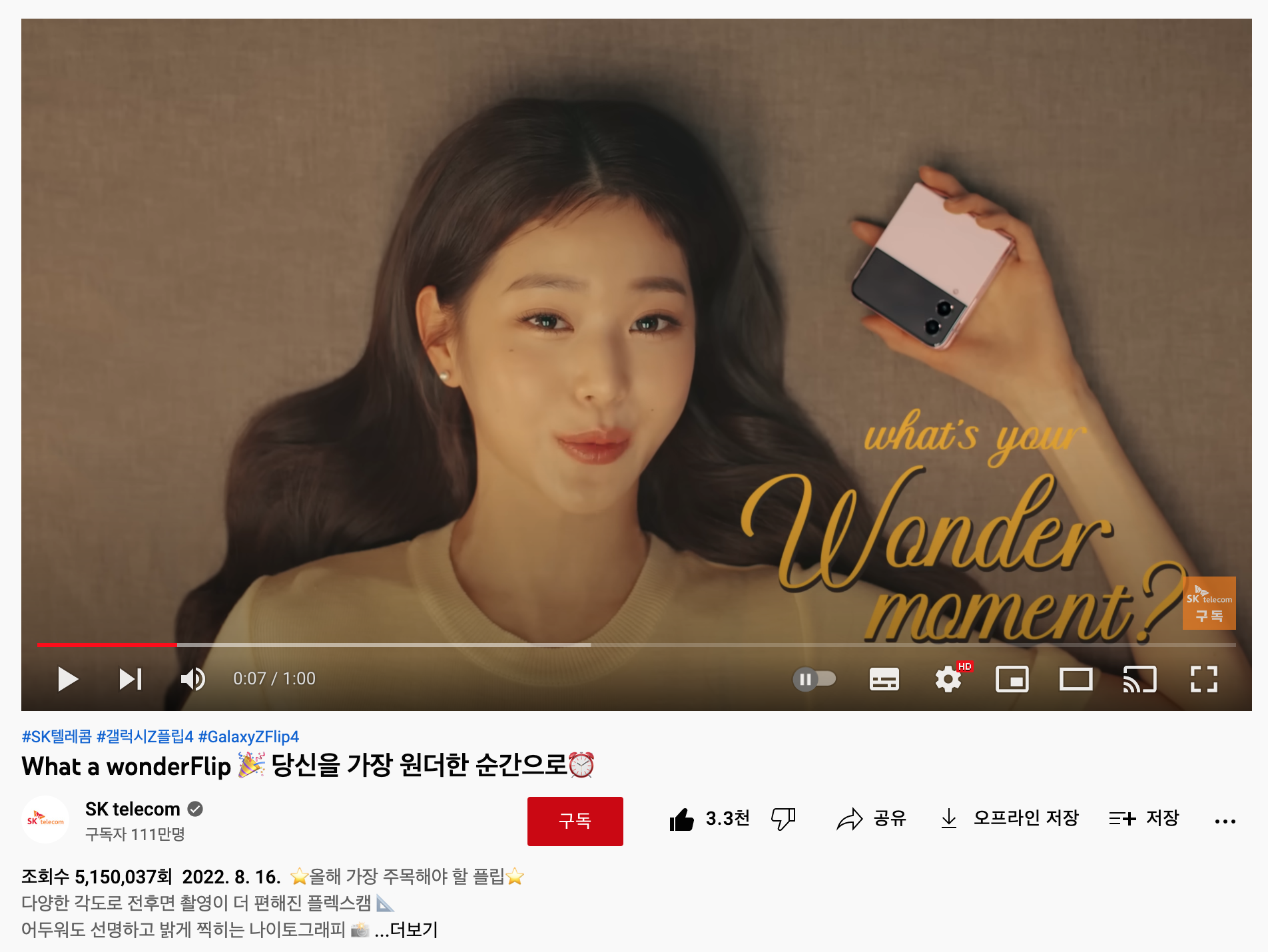 저도 그 광고를 봤는데 SK텔레콤에서 만든 광고인데 Z플립4를 사용하는 모습이 상당히 잘 어울리고 젊은 세대에 어필하게 만들었다는 생각을 했습니다.
