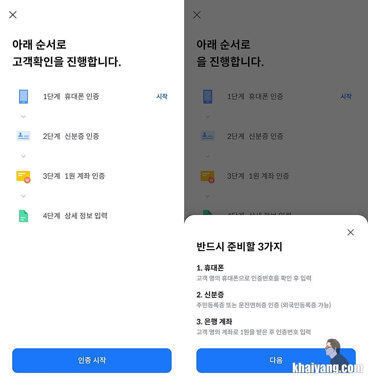 화면캡쳐는 보안 때문에 안되서 따로 보여드리지 못하지만 진행과정은 어렵지 않습니다. 휴대폰 인증 받으면 되고, 신분증 인증은 가지고 있는 플라스틱 실물 카드를 카메라로 촬영 하시면 됩니다.