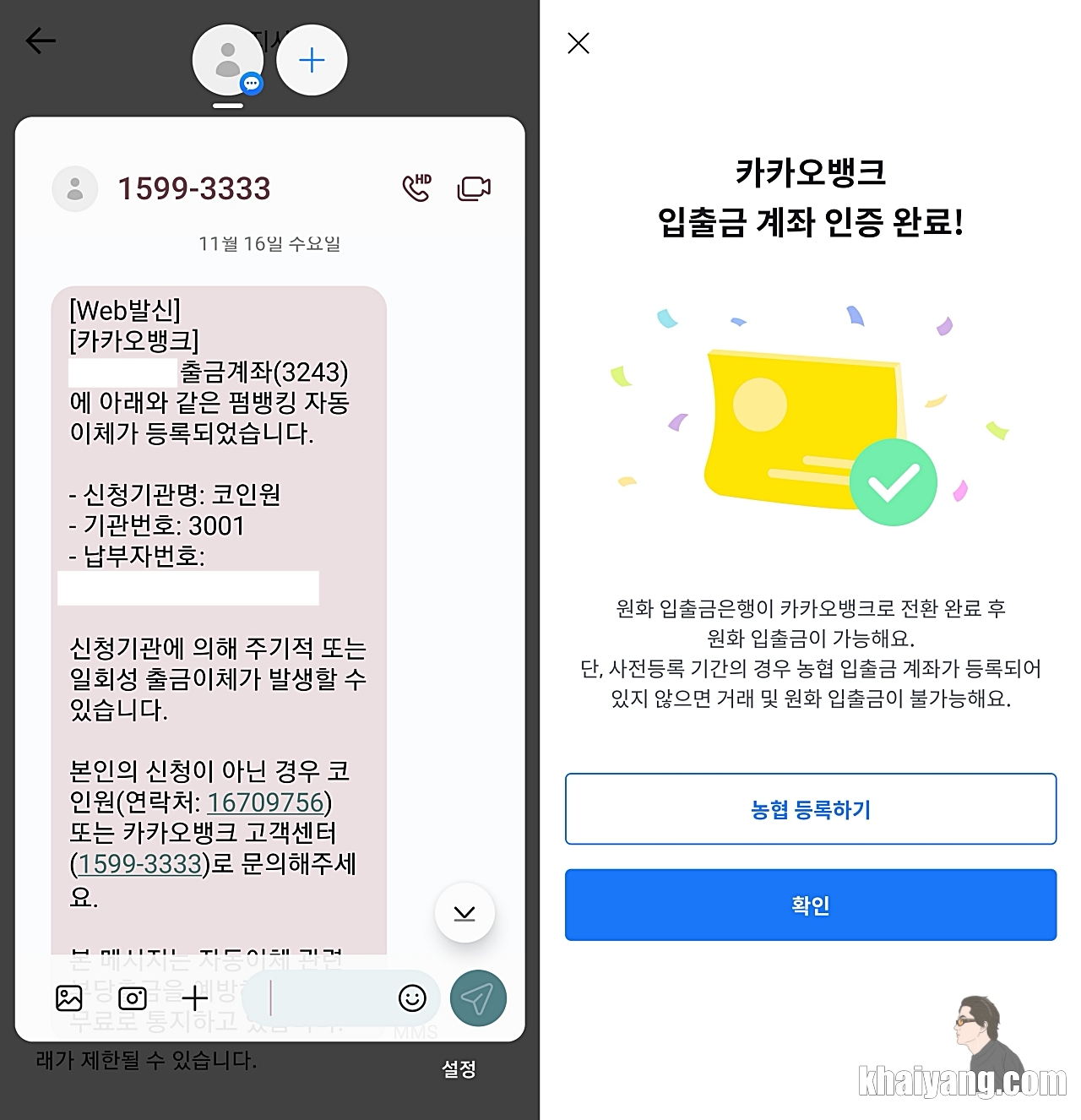만약 급하게 지금 바로 코인원을 이용해야 한다면 카카오뱅크가 아닌 농협은행 계좌를 인증하시면 됩니다.