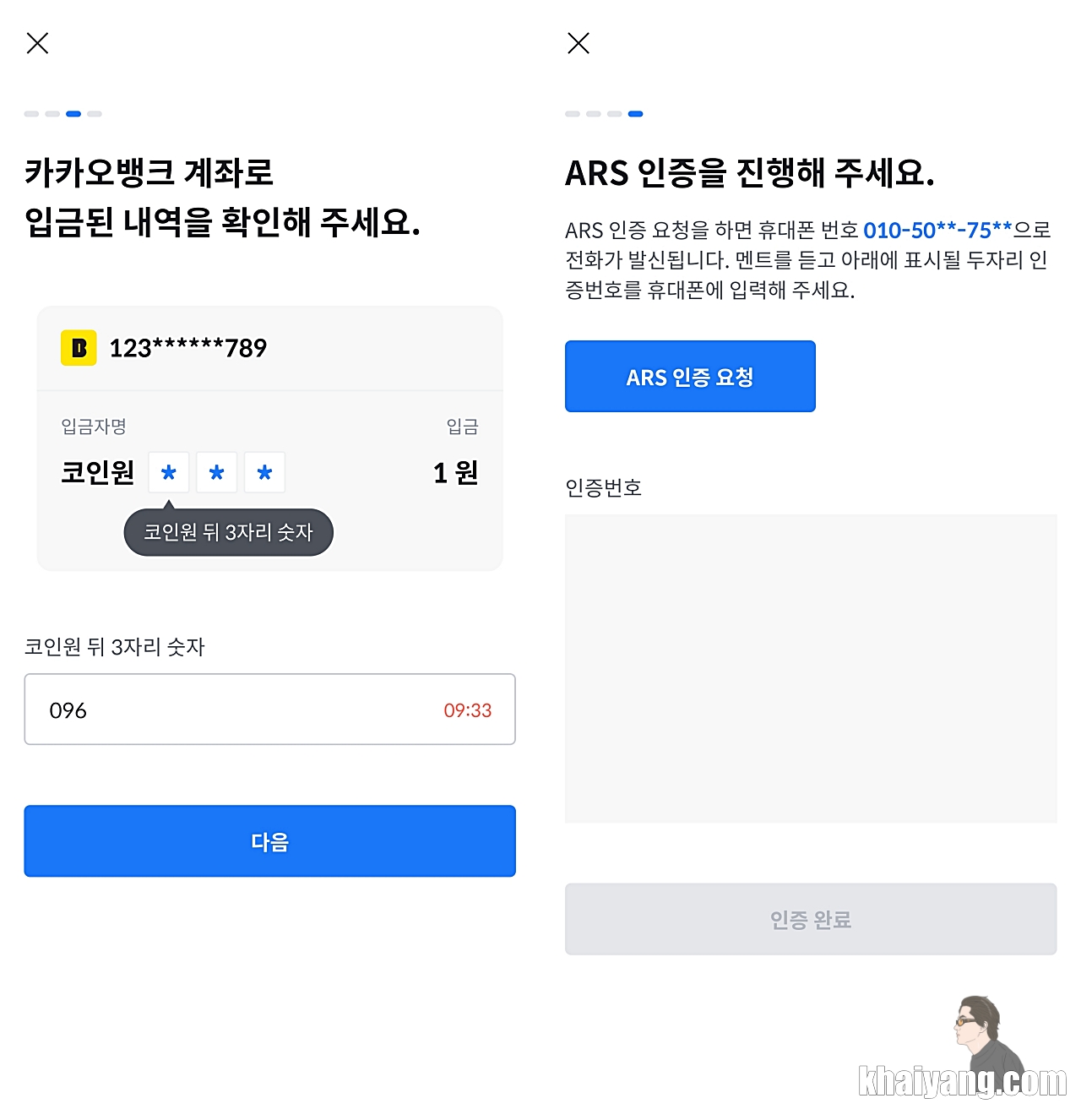 인증을 마무리 하면 카카오뱅크에서 알림톡이 오는데 본인 계좌에 1원 입금이 됩니다. 알림톡 내용을 잘 보면 코인원 096 표시가 되어 있습니다. 인증을 받으실때 여기 나온 숫자 096 을 넣으시면 됩니다.