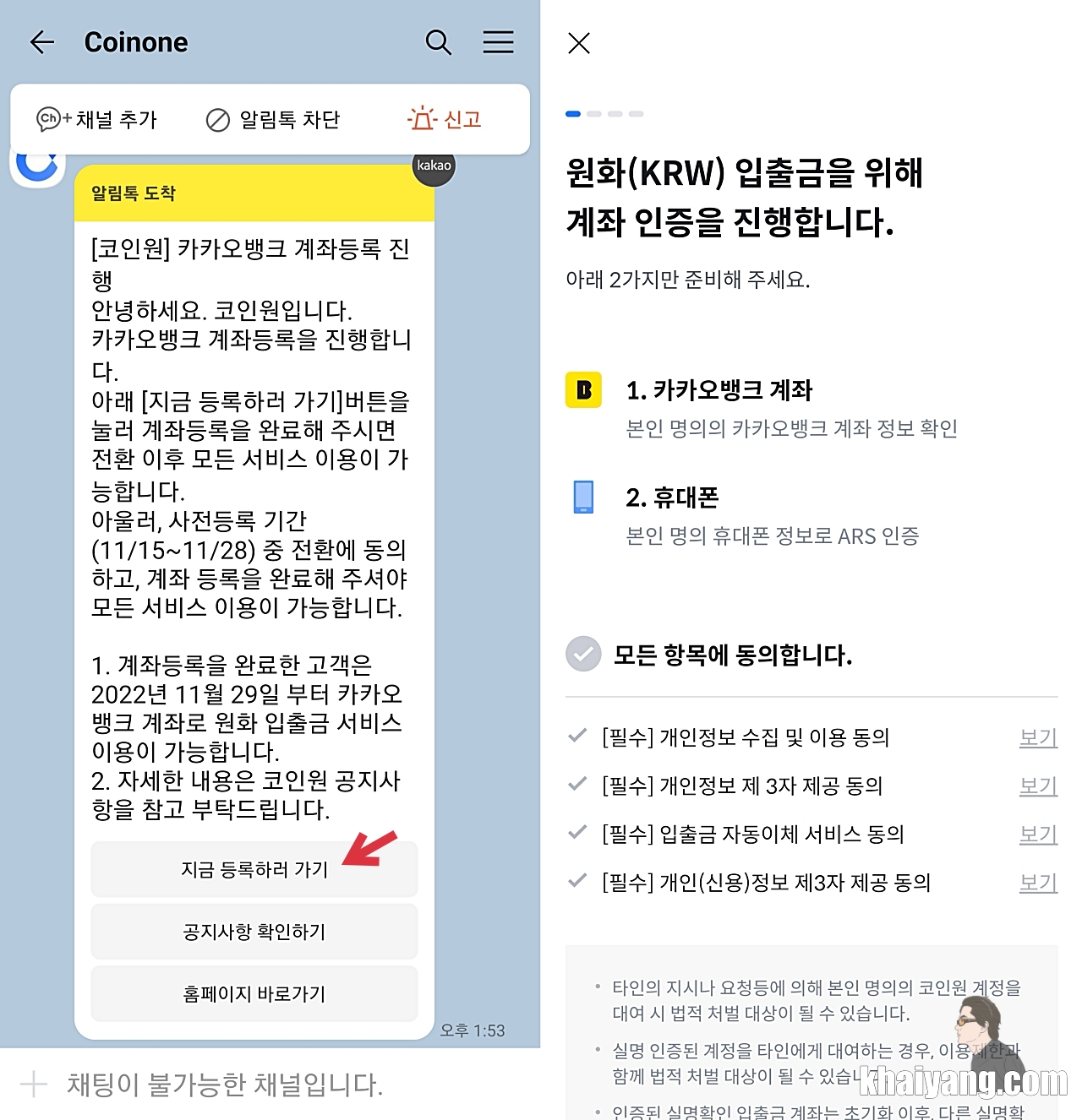 받은 알림톡에서 '지금 등록하러 가기' 메뉴를 터치 합니다. 이후 진행할 부분은 본인의 카카오 뱅크 계좌 정보 확인과, 본인 명의 휴대폰 정보로 ARS 인증을 하시면 됩니다.