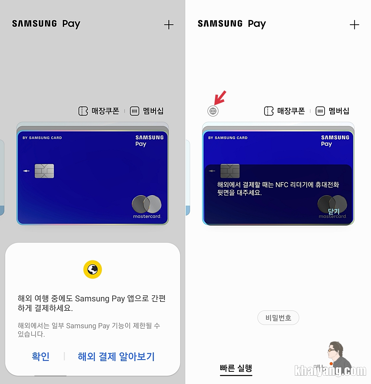 해외에 나가서 삼성페이를 실행하면 하단에 삼성페이 사용 방법에 대한 팝업창이 뜹니다. 그리고 화살표로 표시된 지구본 모양이 표시 되는 등 한국과는 다른 모습을 볼 수 있습니다.