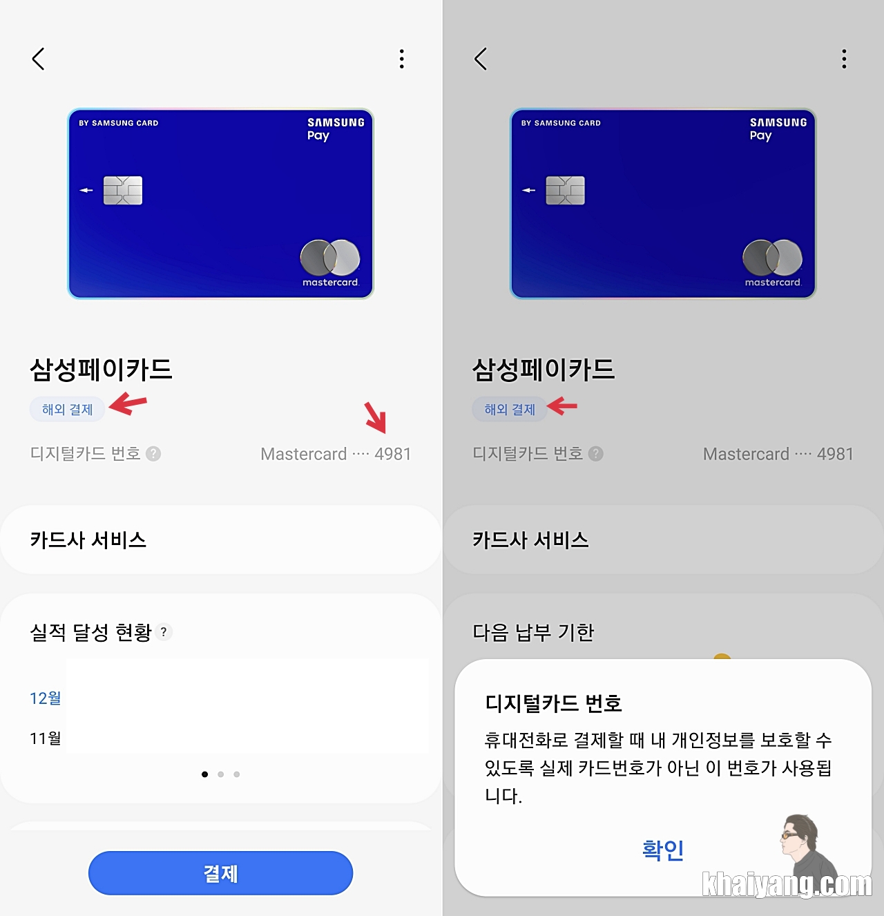 그리고 결제할때 해외 매장 직원이 카드번호 확인을 요청할 경우 디지털 카드 번호 4자리를 알려 주시면 됩니다. 삼성페이 결제할때 4자리의 카드 번호가 생성 됩니다.