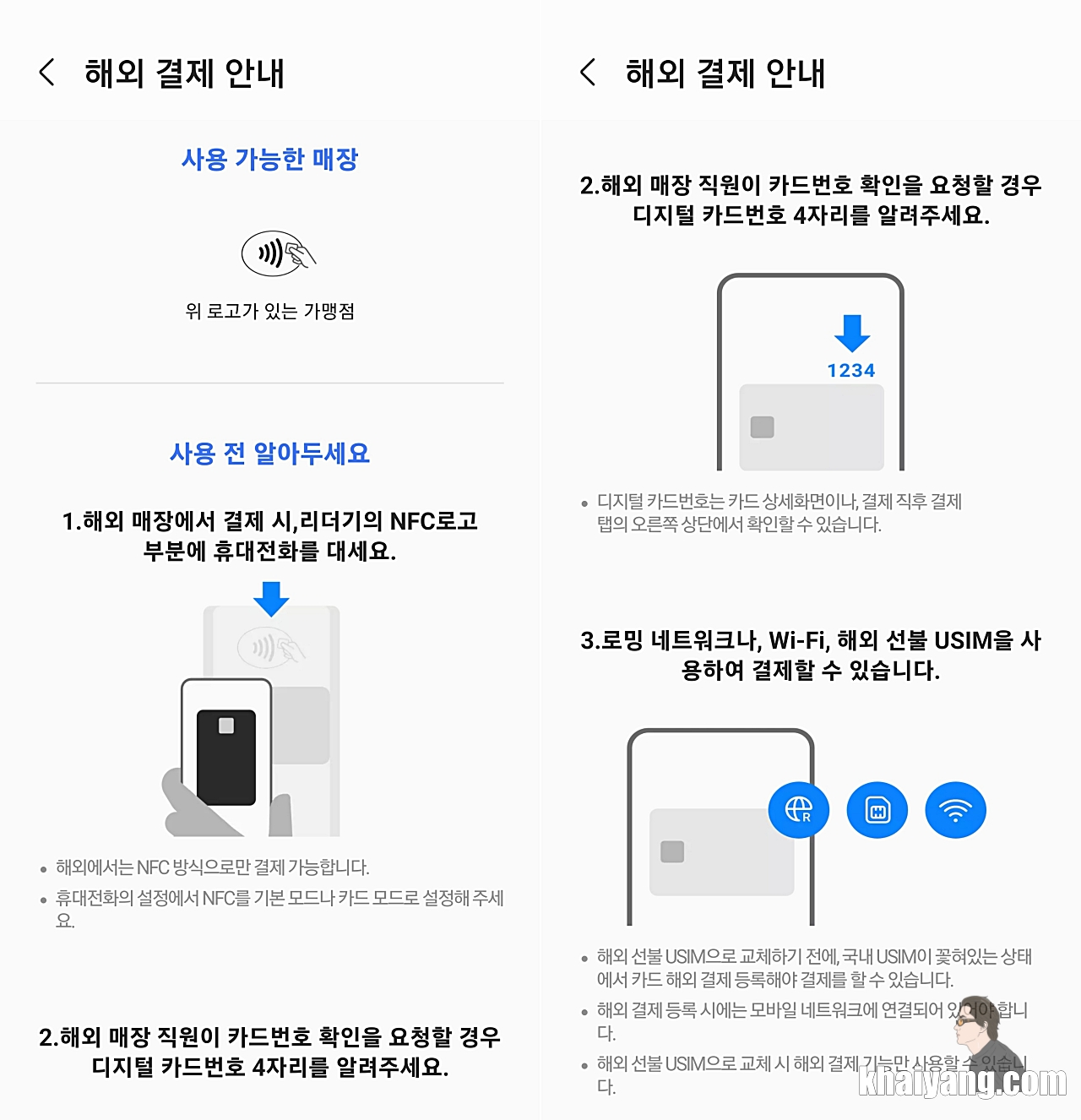 만약 삼성페이를 사용하는데 위에서 언급한 4종류의 카드가 없다면 해외에서도 삼성페이 사용은 불가능 합니다. 이 부분 꼭 확인하시기 바랍니다.