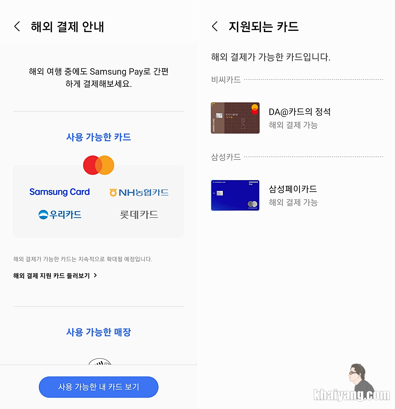 삼성페이에 등록된 카드중에 해외이용이 가능한 카드는 자동으로 알아서 확인을 시켜 줍니다.