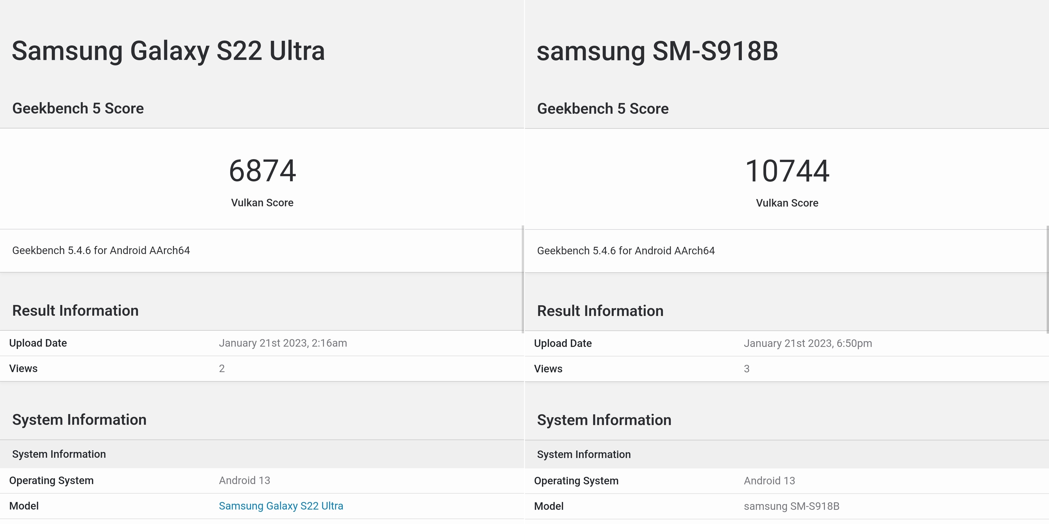긱벤치 5 스코어를 보면 갤S22 울트라가 6874, 갤S23 울트라 10744로 성능이 많이 향상된 것을 발견할 수 있습니다.