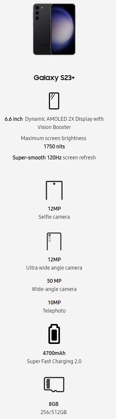 카메라 부분을 보면 전면은 1200만 화소로 갤S23 시리즈 모두 동일한 것 같습니다. 후면을 보면 1200만 화소 울트라 광각, 2억 화소 광각 일반, 1천만 화소 2개의 망원 렌즈가 탑재 되었습니다.