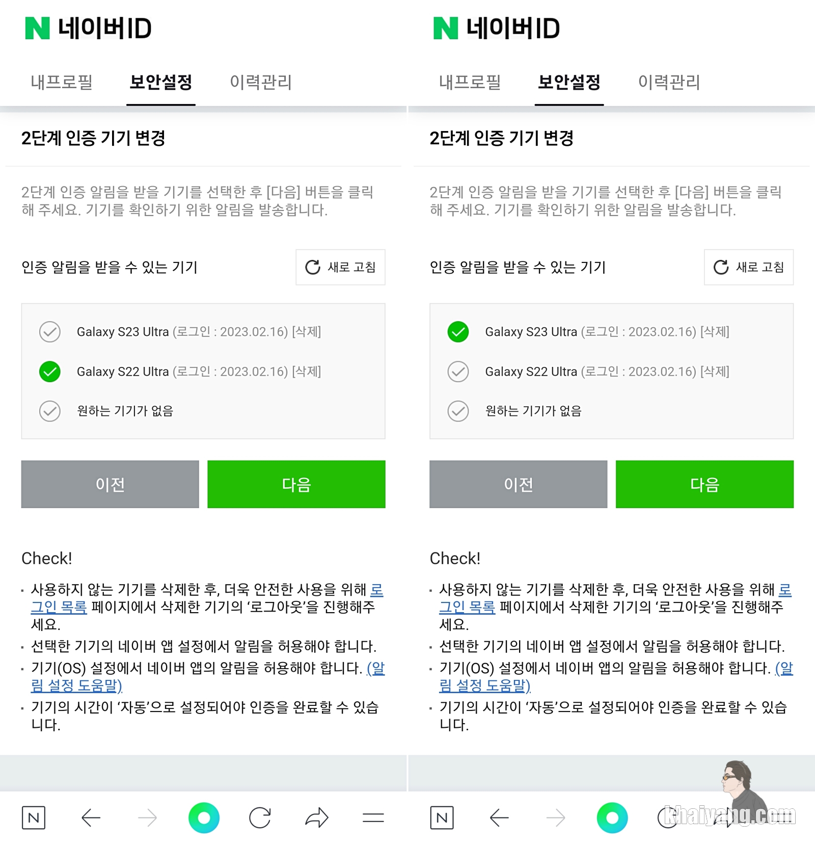 저도 갤럭시S22 울트라에서 갤럭시S23 울트라로 바꾸고 나서 이것 저것 세팅하느라 정신이 없습니다. 세팅하실때 네이버를 평소에 많이 이용하시는 분들은 네이버 2단계 인증 부분을 꼭 잊지 마시고 하시기 바랍니다.