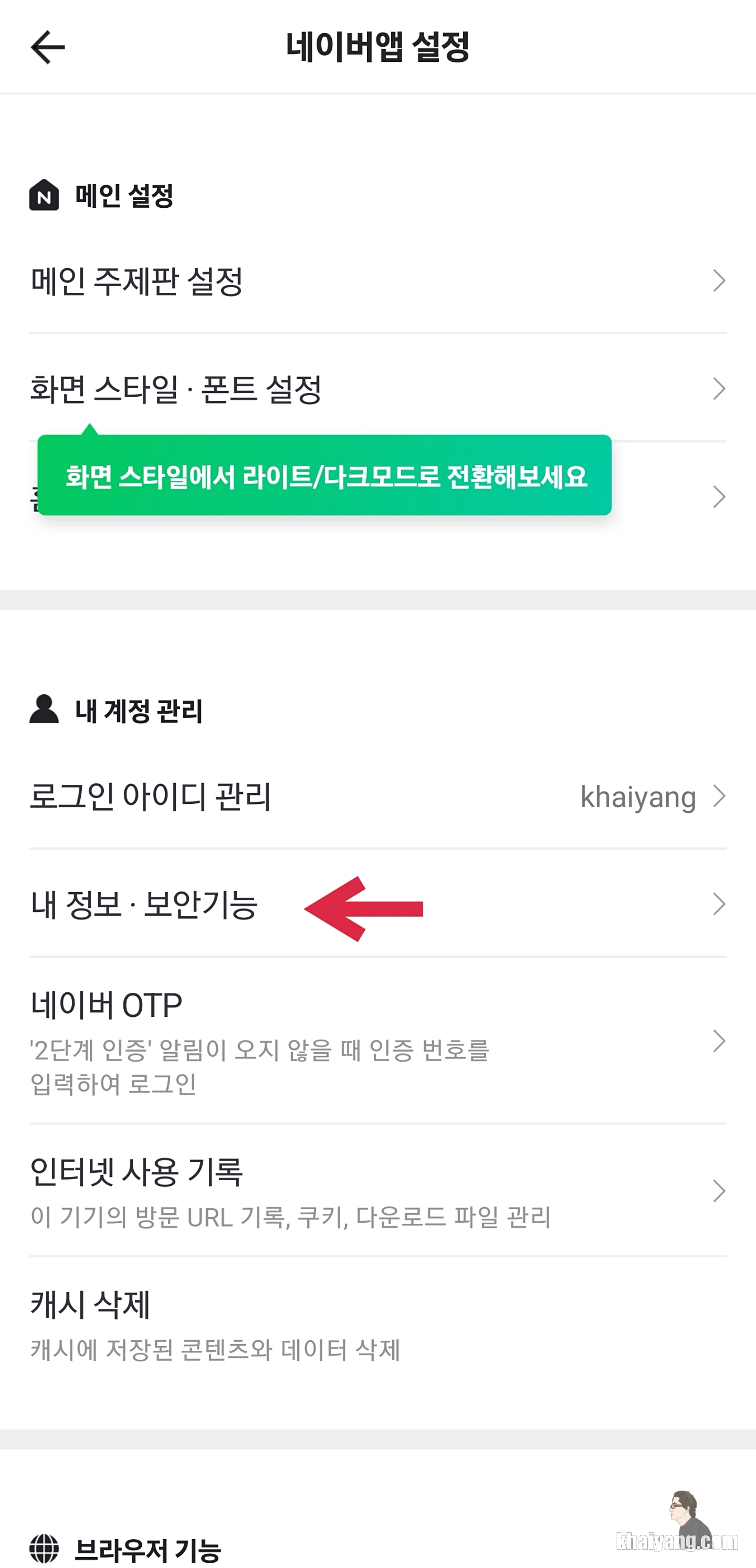 그럼 이런 화면이 나오는데 여기서 화살표가 표시된 '내정보. 보안기능' 부분을 누릅니다.