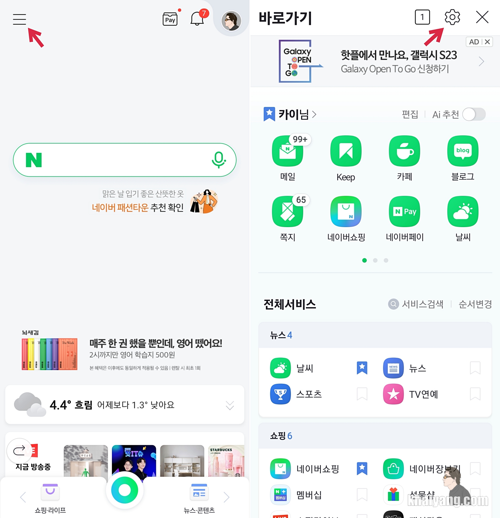 네이버 앱을 여시고 나서 화살표 표시 되어 있는 부분을 터치 하시고 톱니바퀴 설정에 들어 갑니다.