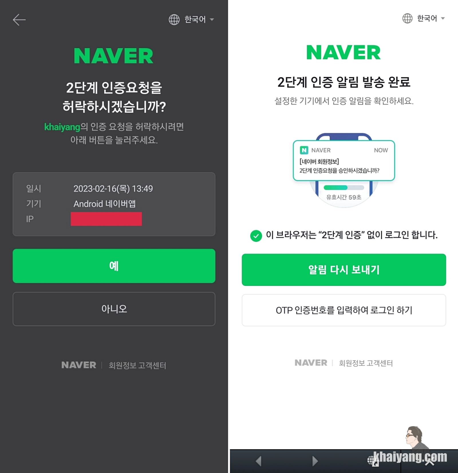 그래서 작업 하실때는 구형폰을 옆에 두고 하시면 바로 네이버 2단계 인증 알림을 바로 확인할 수 있습니다.