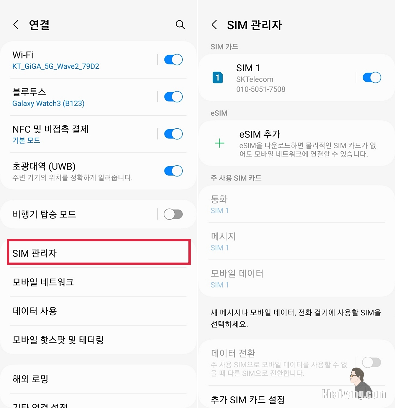 갤럭시S22 사용할때는 보지 못했던 메뉴가 생겼는데 설정-연결 메뉴에 들어가면 SIM 관리자 항목이 있습니다.