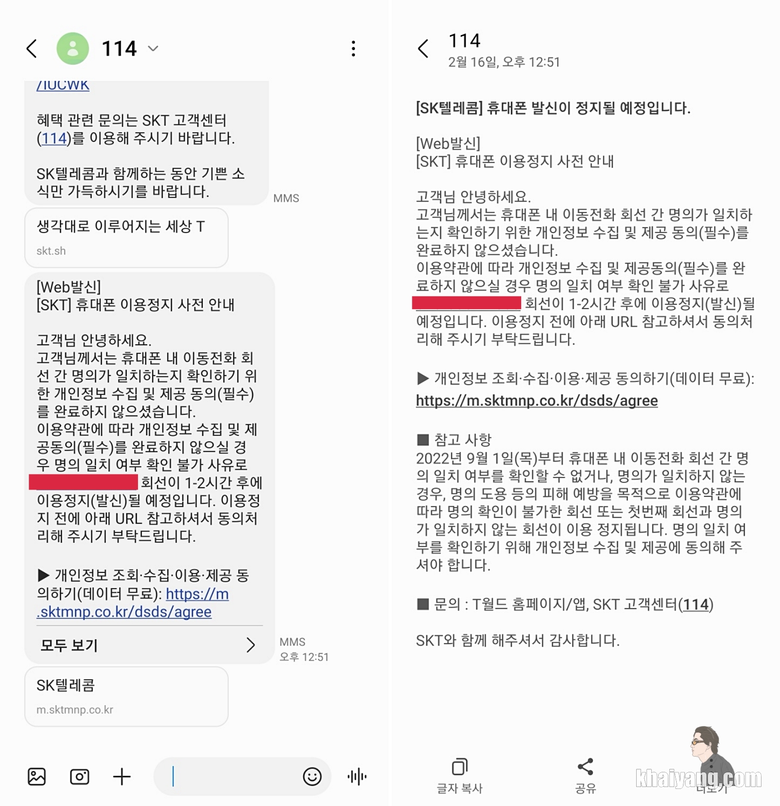 유심을 바꾸고 나면 문자가 오는데 잘 확인해 보면 '휴대폰 이용정지 사전안내' 문자 입니다. 이전에는 이런 문자를 받아본 적이 없어서 글도 안 읽고 지나칠 수 있습니다.
