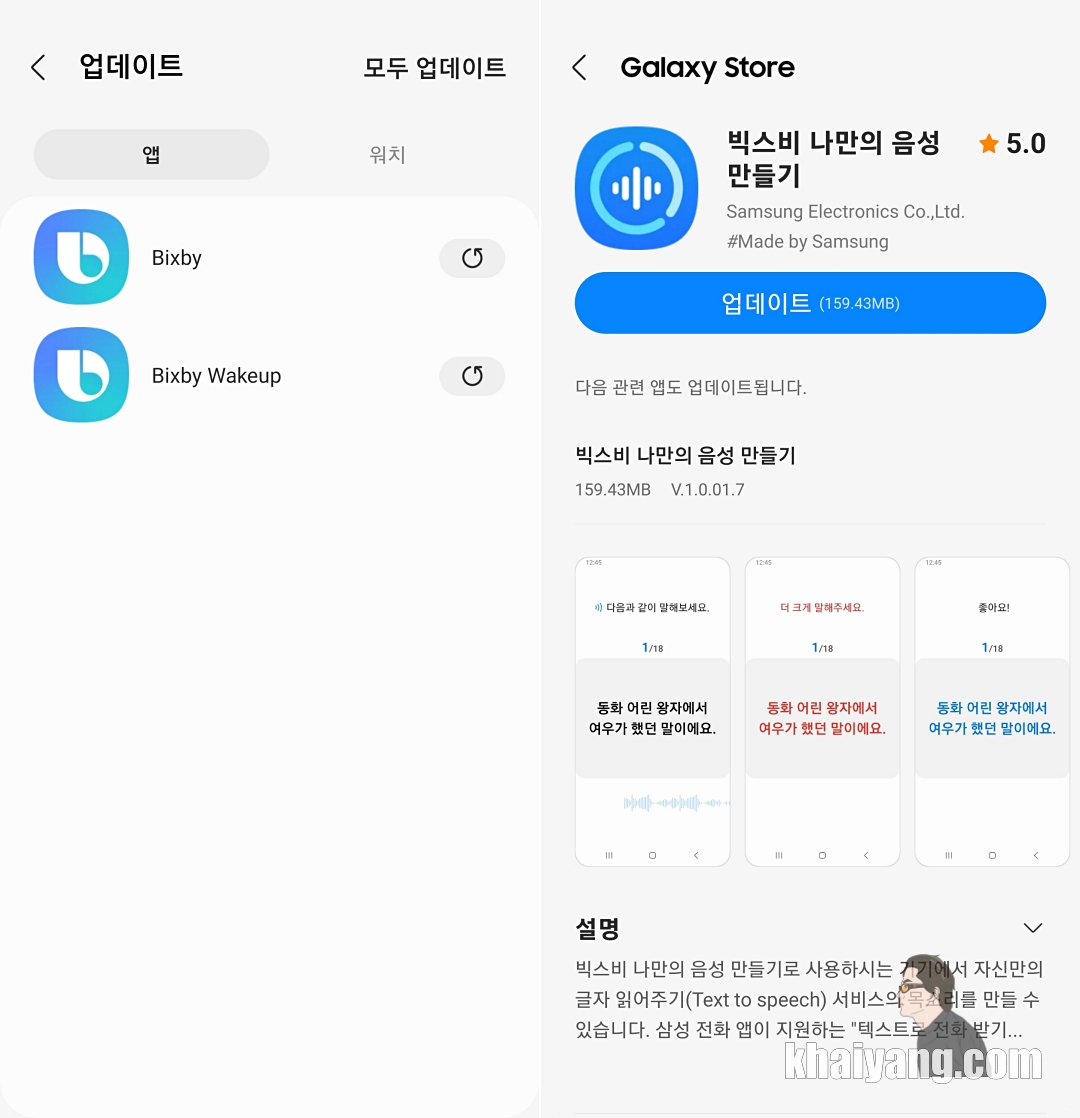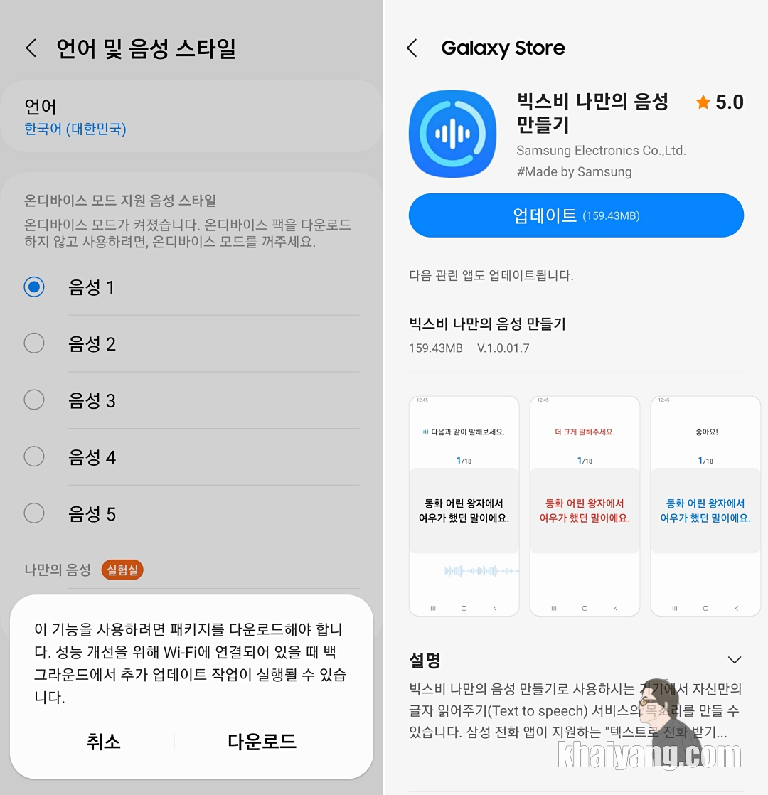 이 기능을 사용하기 위해서는 역시 패키지를 다운로드 해야 합니다. 다운로드 버튼을 누르면 '빅스비 나만의 음성 만들기' 앱이 업데이트가 됩니다.