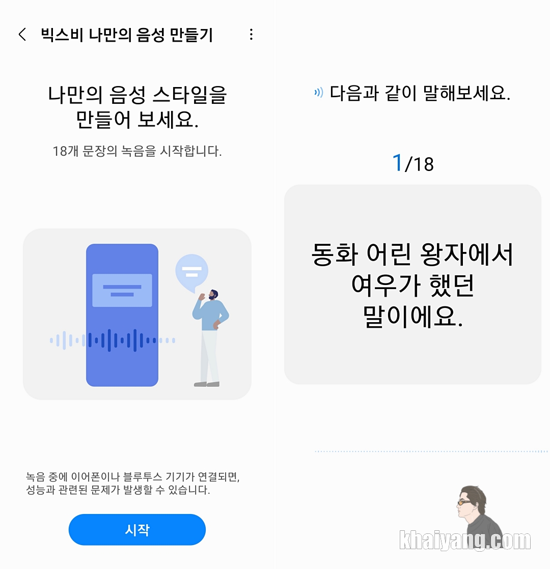 호출어를 만드는 것 보다는 좀 시간이 걸리는 과정이 필요합니다. 호출어는 갤럭시 5번만 부르면 끝이지만 음성 만들기는 18개의 문장을 또박 또박 읽어야 합니다.
