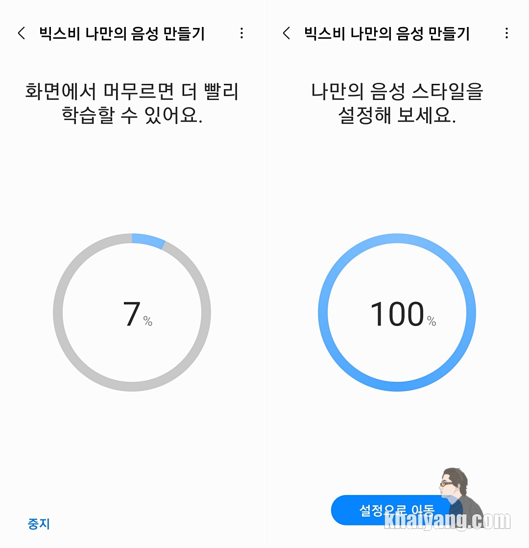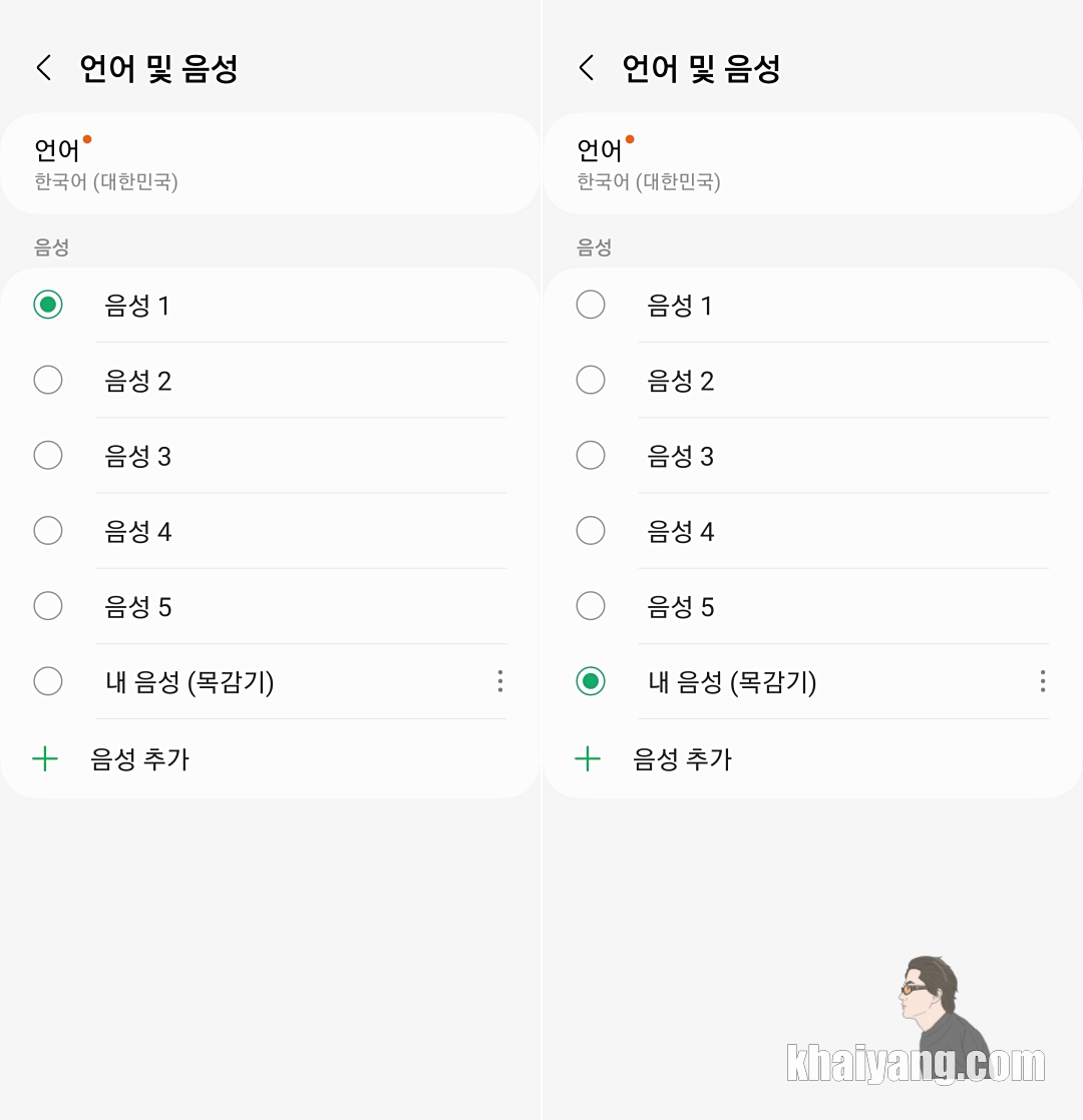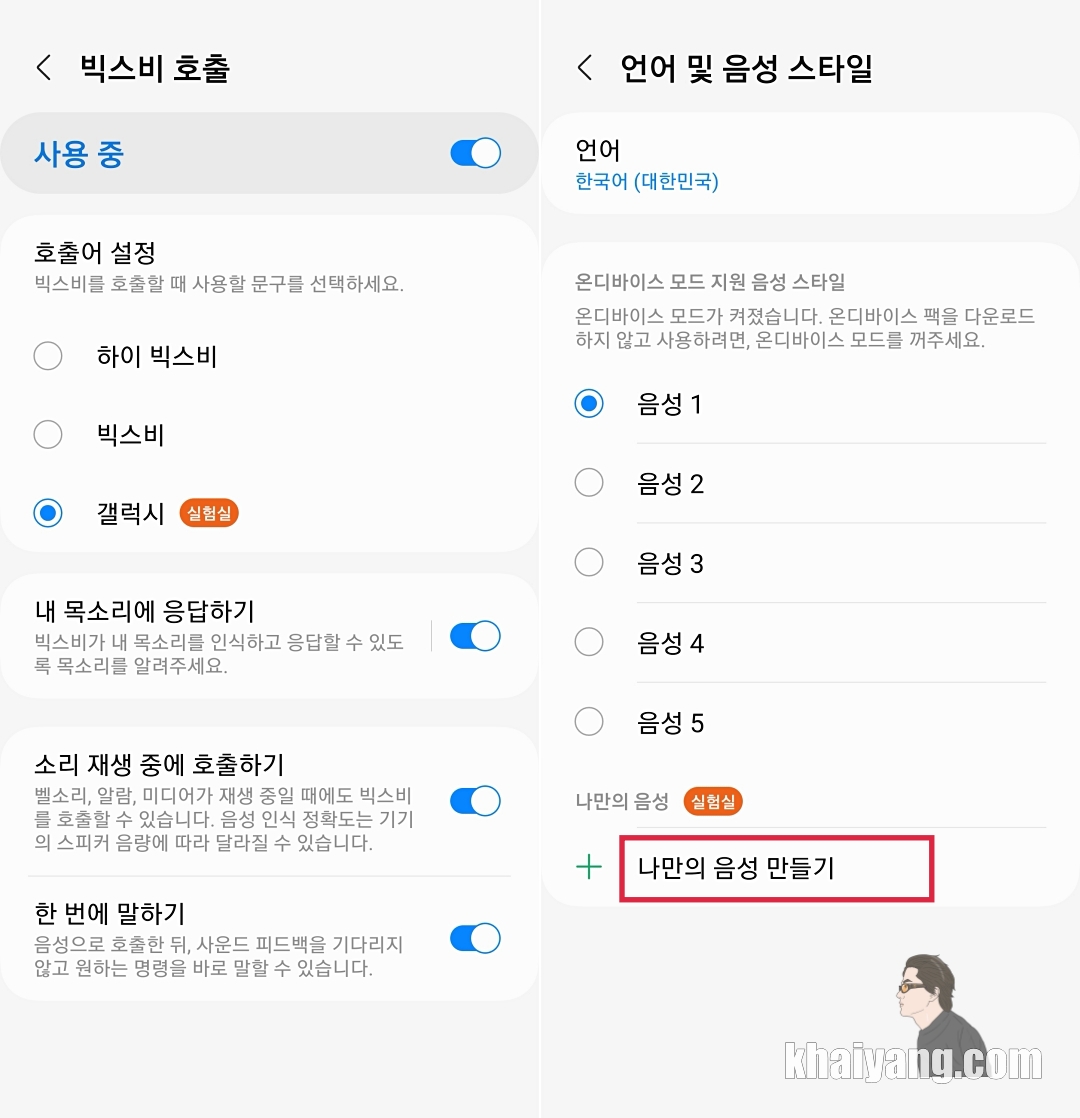 그런 경우 다시 설정에서 언어 및 음성스타일 항목에 가셔서 내 음성 항목을 체크해 주셔야 합니다. 이렇게 하면 이제 완벽하게 갤럭시로 호출하고 내 음성으로 답변을 들을 수 있습니다.