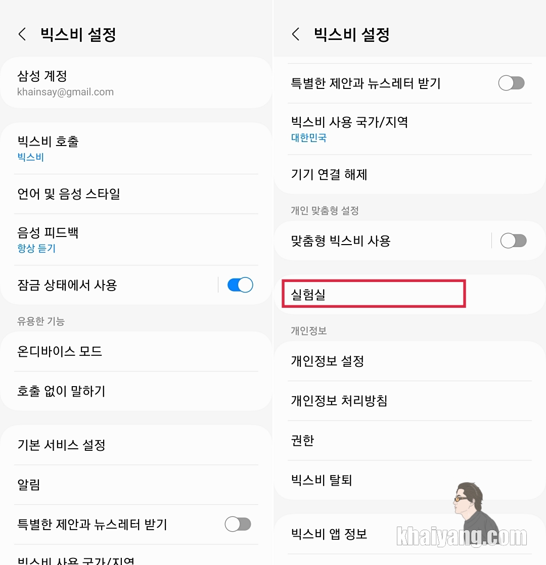 바로 빅스비를 열고 설정에 가서 하단에 있는 실험실 메뉴를 엽니다.
