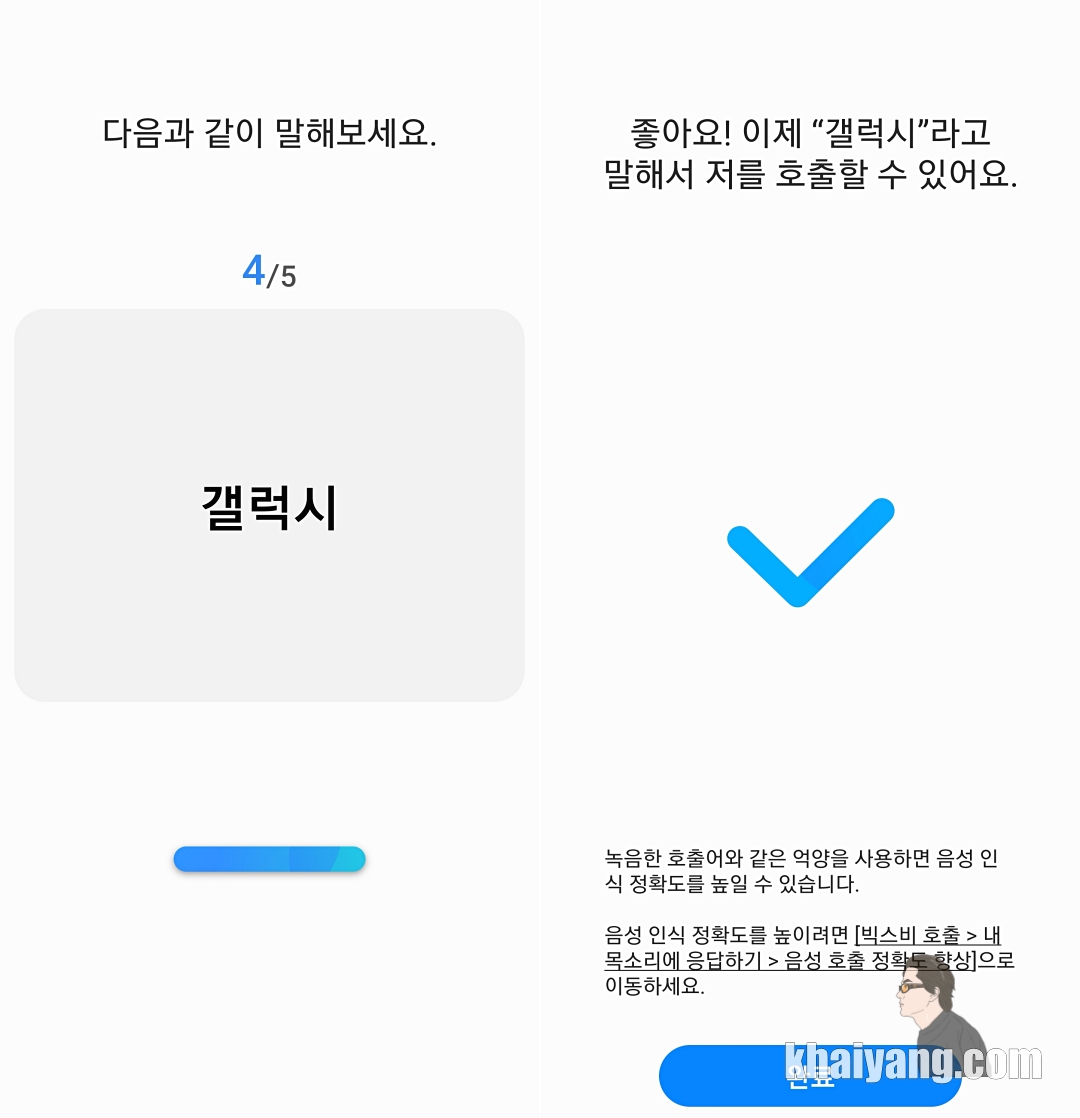 총 5번에 걸쳐서 갤럭시를 말하면서 음성인식을 시킵니다. 이제부터 빅스비가 아닌 갤럭시로 빅스비를 호출할 수 있게 되었습니다.