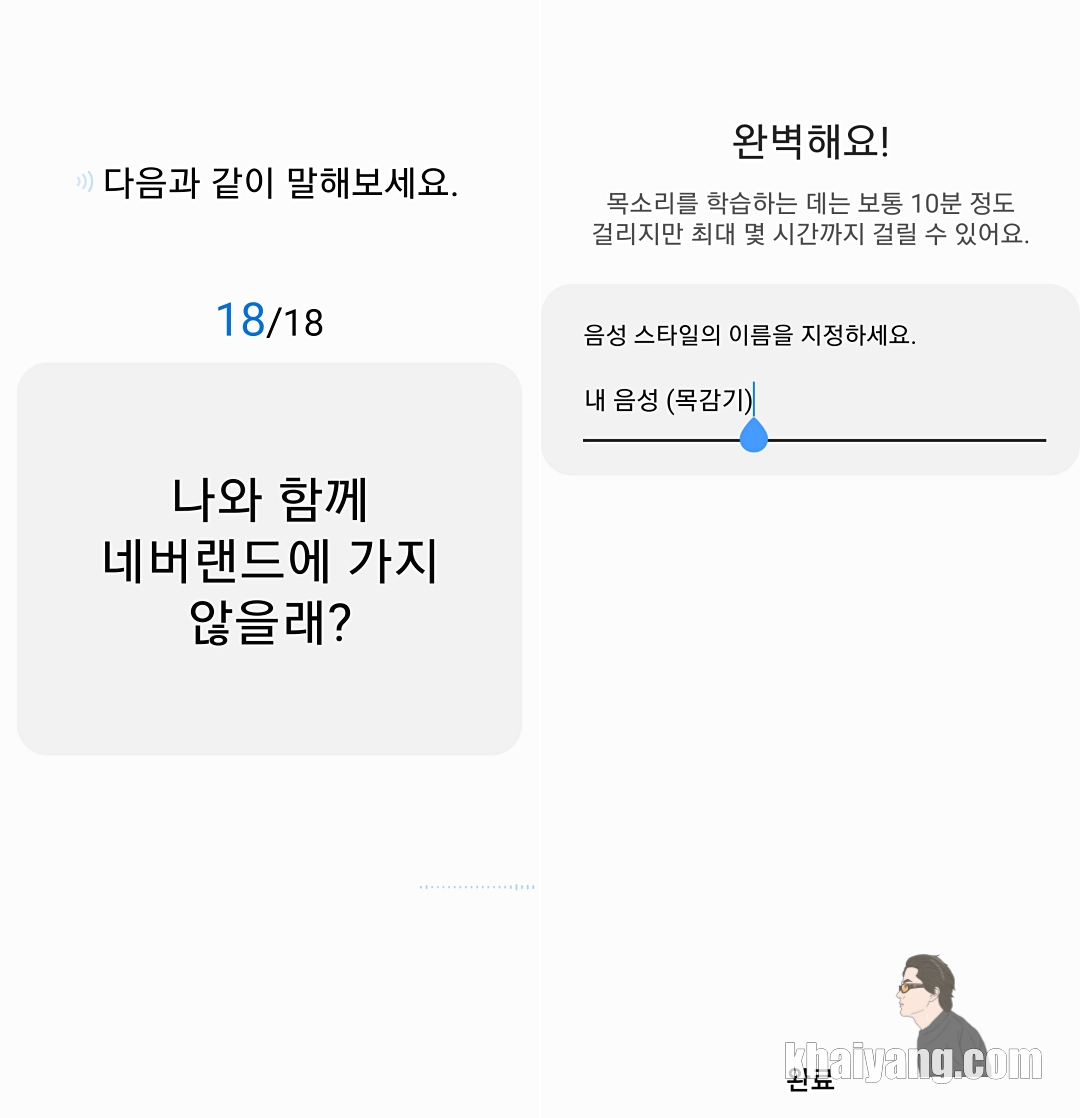 호출어를 만드는 것 보다는 좀 시간이 걸리는 과정이 필요합니다. 호출어는 갤럭시 5번만 부르면 끝이지만 음성 만들기는 18개의 문장을 또박 또박 읽어야 합니다.