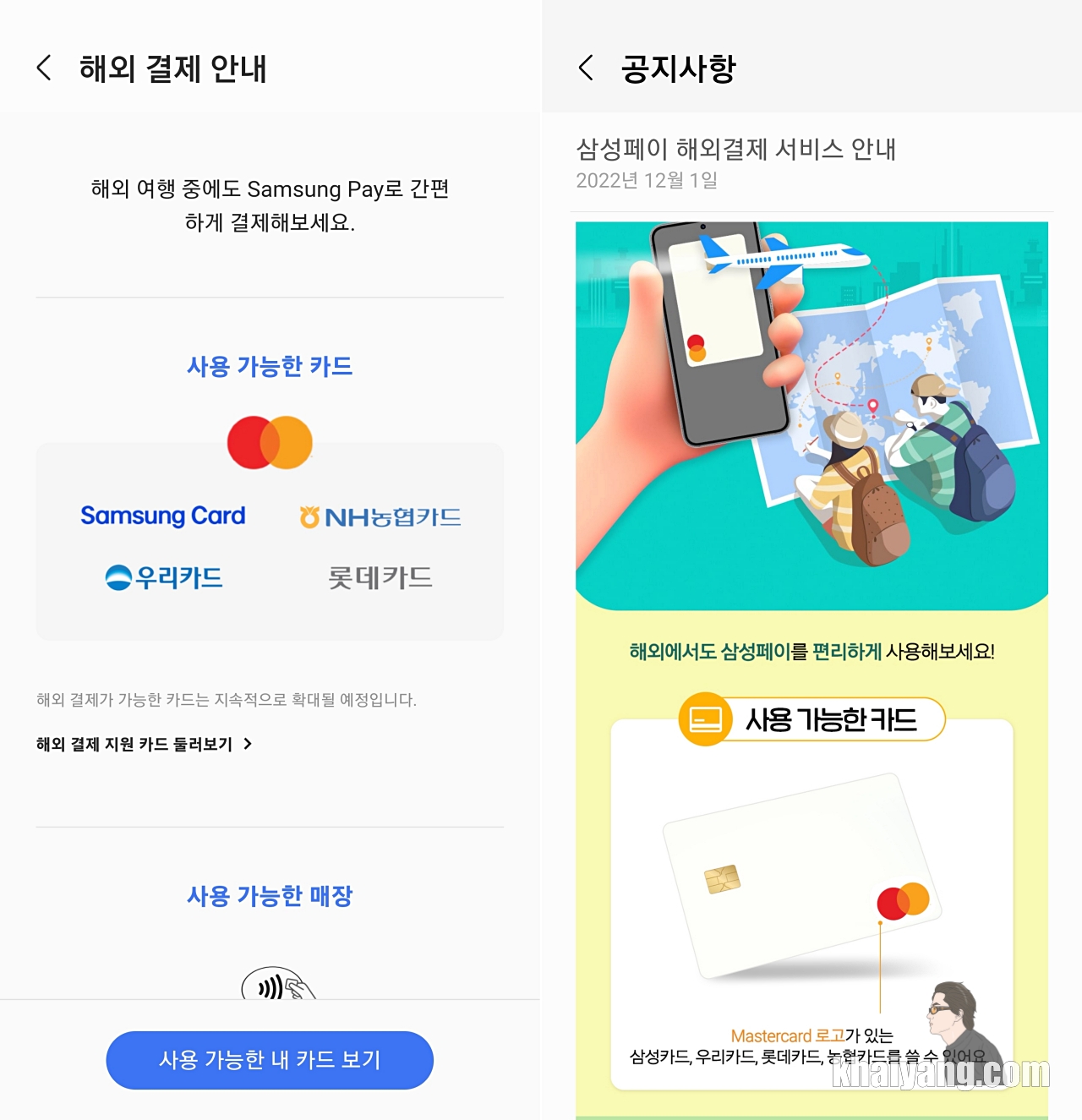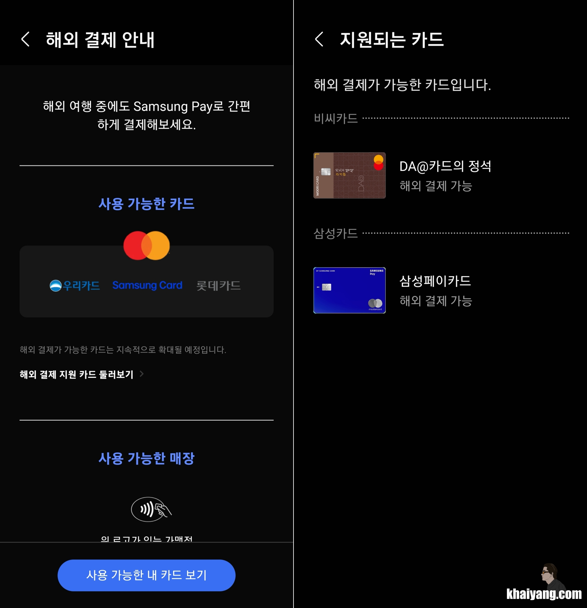 해외결제도 초반에는 이런 저런 제약이 많았는데 시간이 지나면서 불편한 제약이 풀어지면서 사용하기 쉽게 변했습니다. 국내와 달리 해외에서는 애플페이 처럼 NFC 단말기에서만 결제가 됩니다.