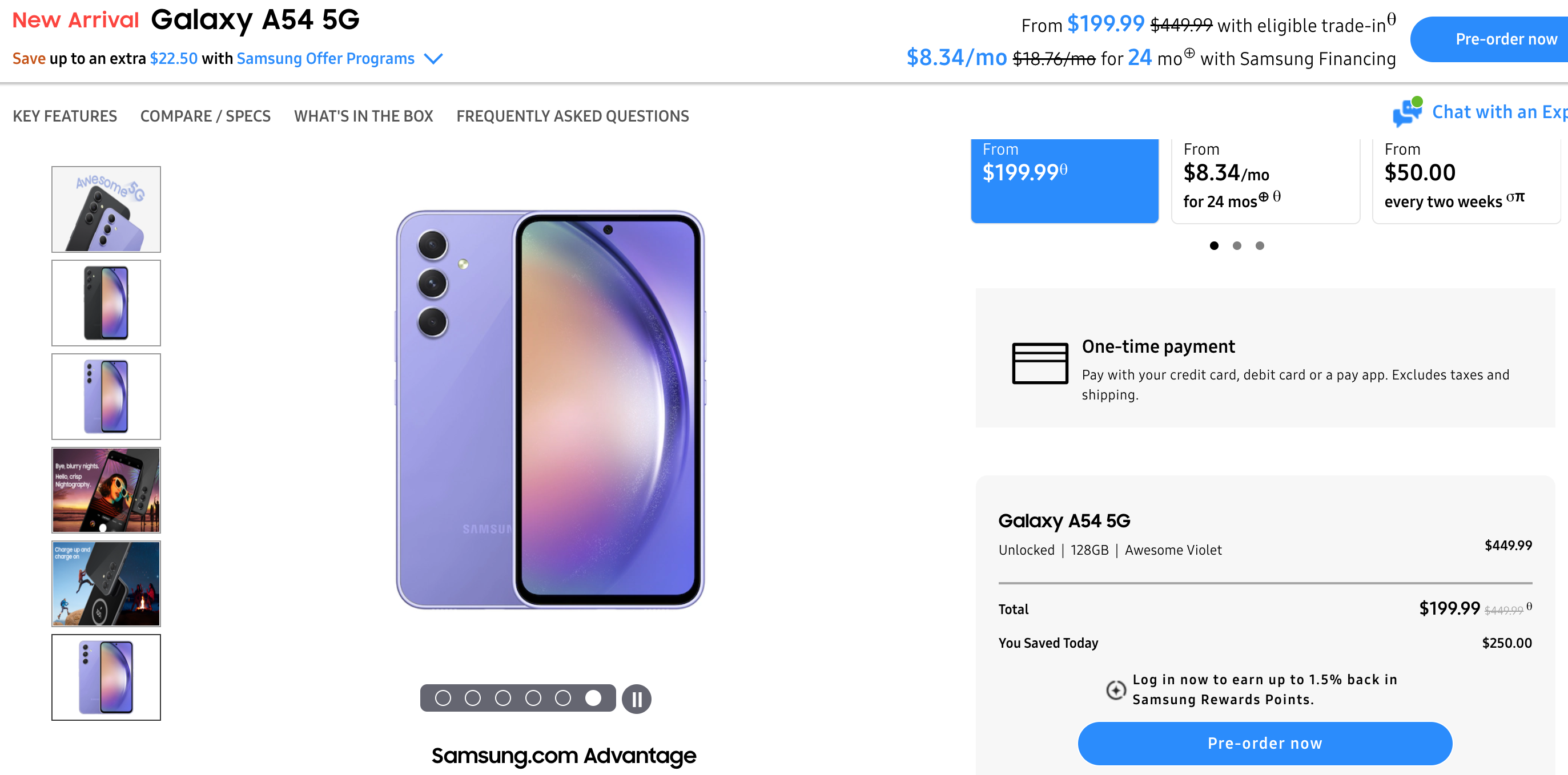 미국에서 출시되는 A54 모델의 출고 가격은 6GB + 128GB 버전이 449.99달러로 450달러에 구매할 수 있습니다. 최대 250달러 보상 판매 프로모션을 적용하면 200달러에 구매가 가능 합니다.