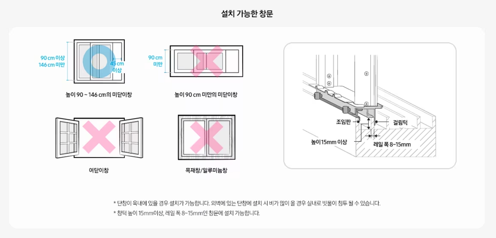 하지만 모든 창문에서 설치가 다 되는 것은 아니니 구매시 꼭 설치 가능한 창문 종류와 사이즈를 확인 하시기 바랍니다. 창문형 에어컨은 여닫이창, 목재창/알루미늄 창에서는 설치가 안됩니다.