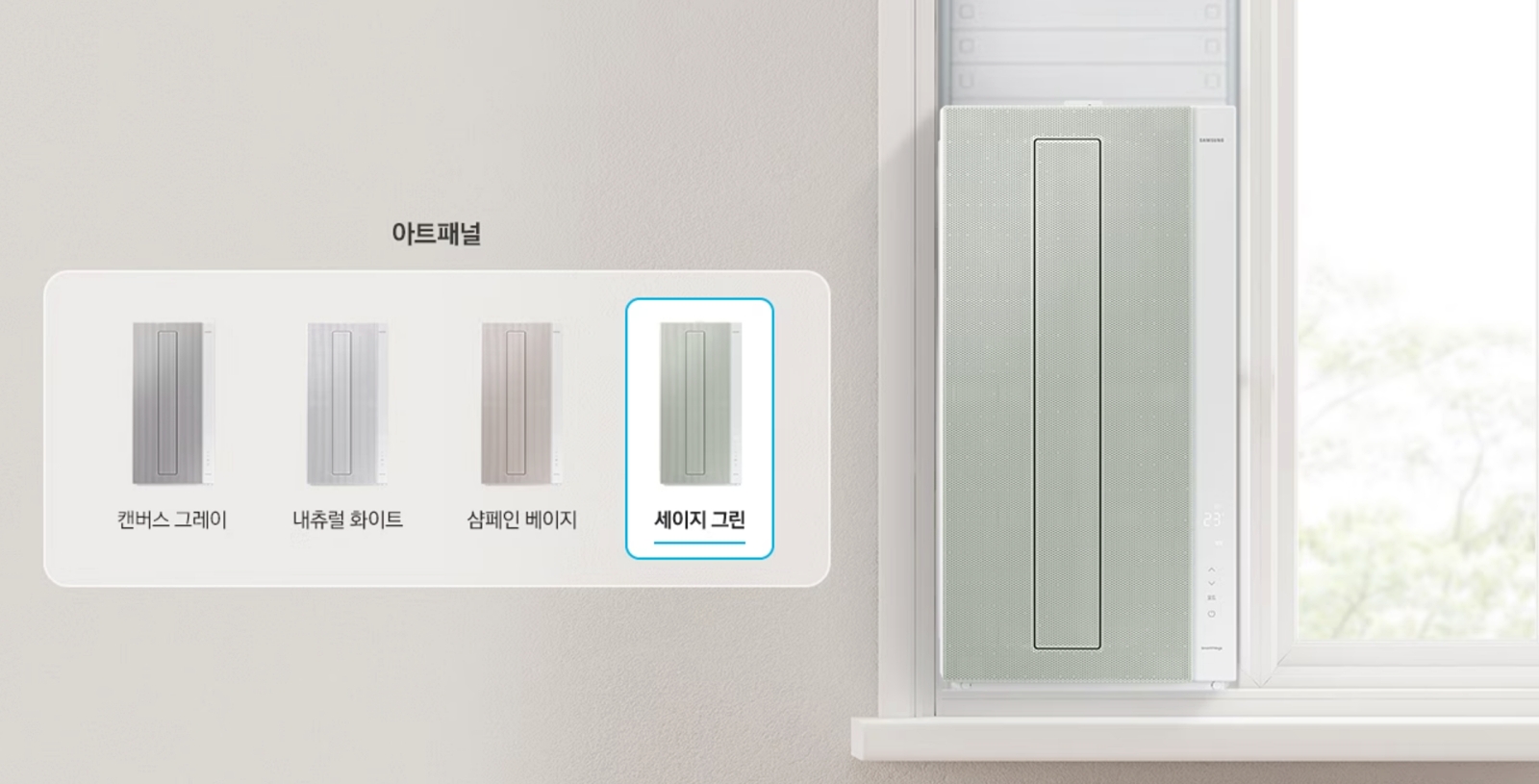 비스포크 무풍에어컨 윈도우핏 역시 상당히 깔끔한 모습을 하고 있습니다. 컬러는 내추럴 화이트, 캔버스 그레이, 세이지 그린,샴페인 베이지의 4가지 색상으로 출시되며, 패널 교체도 가능합니다.