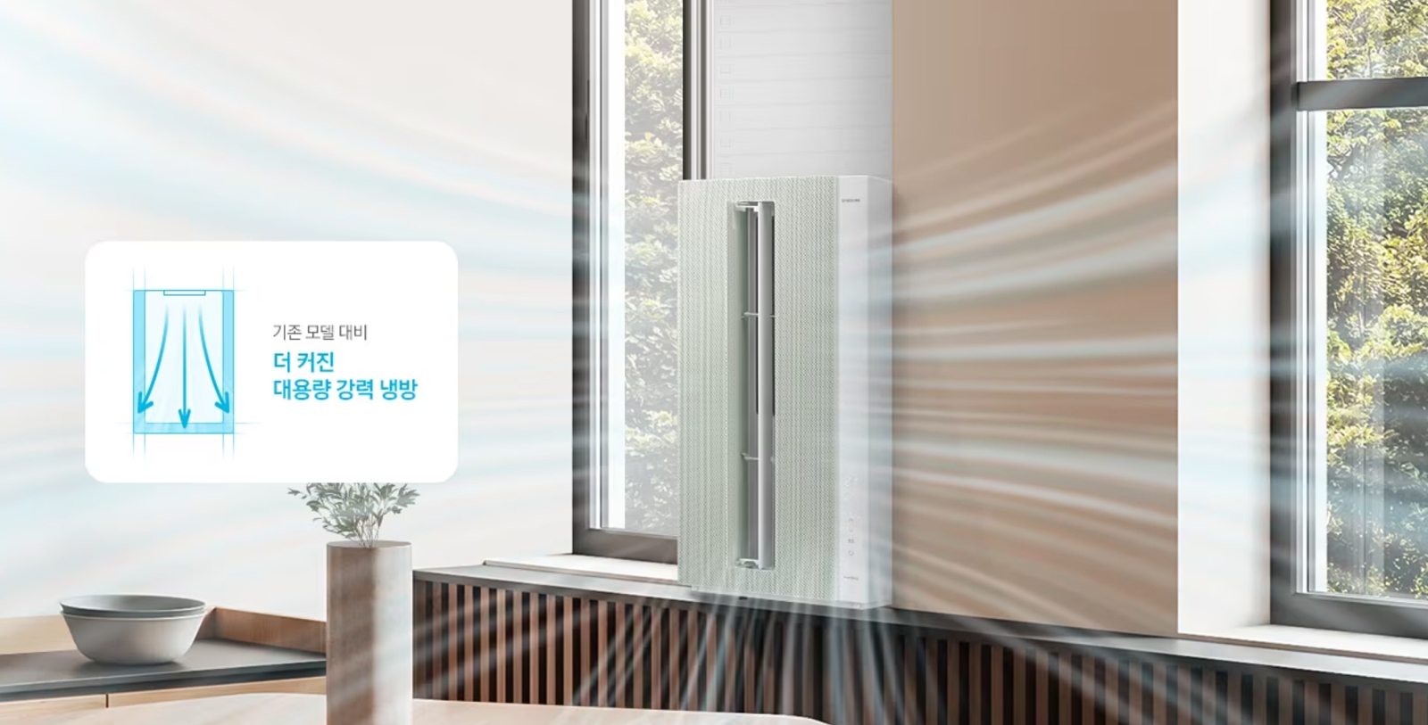 약 17% 커진 냉방 팬을 적용했고, 냉방 용량은 기존 제품 대비 3.3㎡ 확대해서 빠르게 찬 냉기를 전달 합니다.