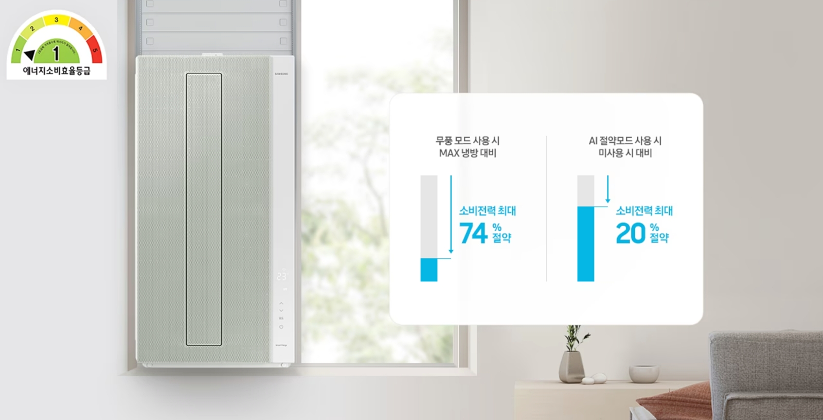 기존 R410A 냉매 보다 지구 온난화 지수가 약 33% 수준인 친환경 냉매 R32를 적용했으며, 에너지 소비 효율 1등급을 획득했습니다.
