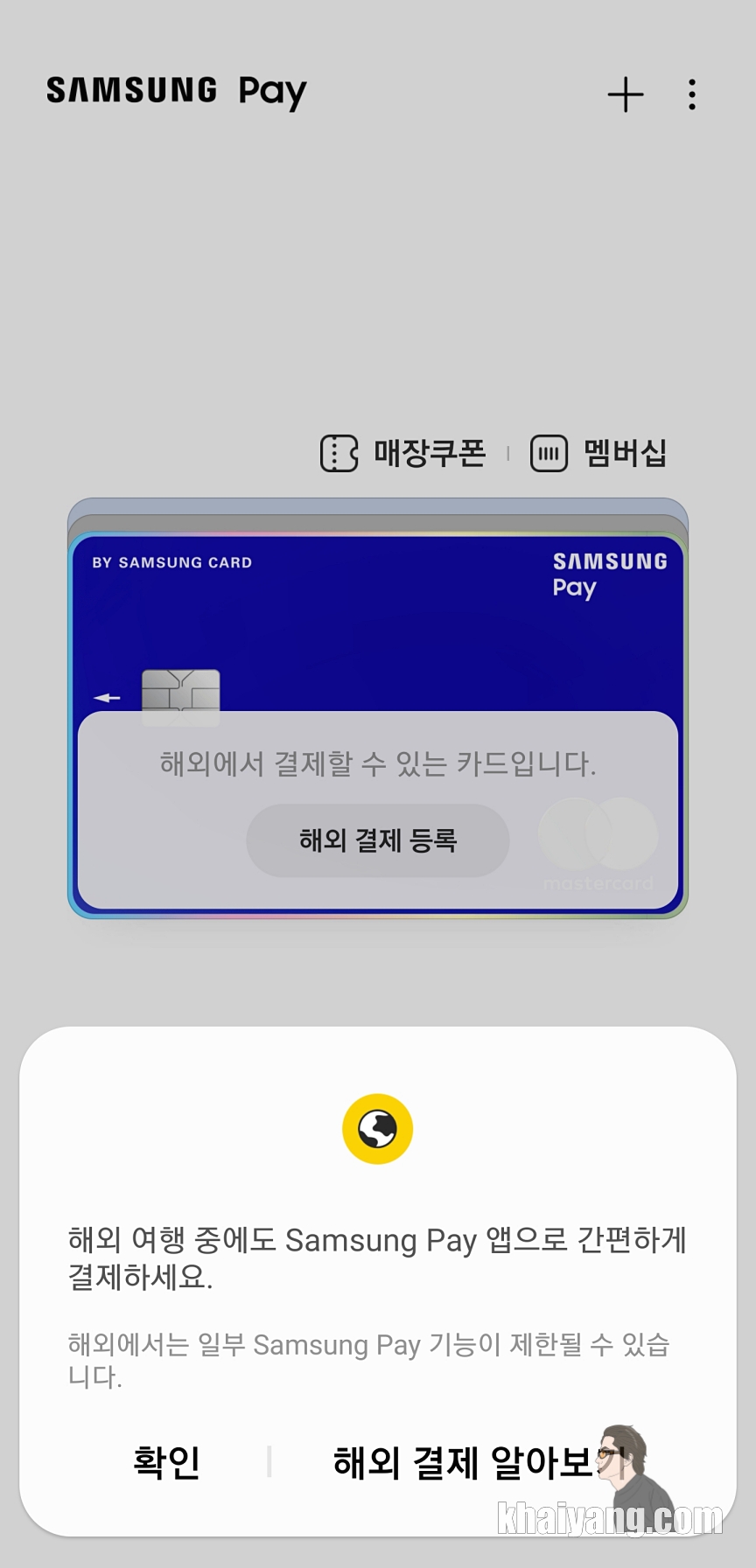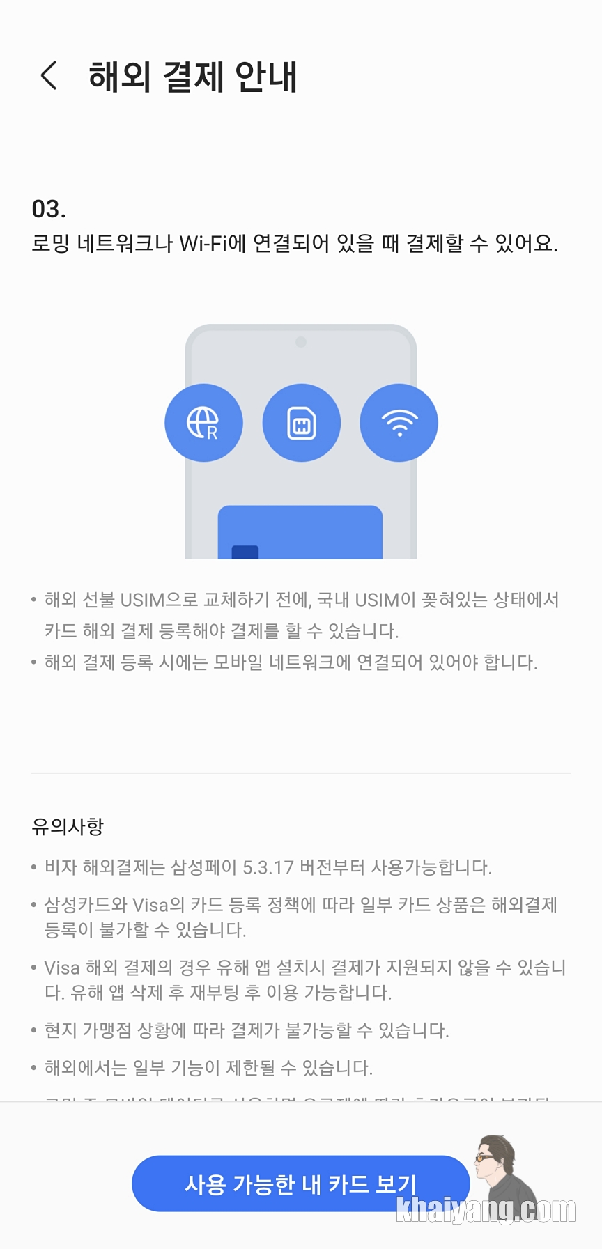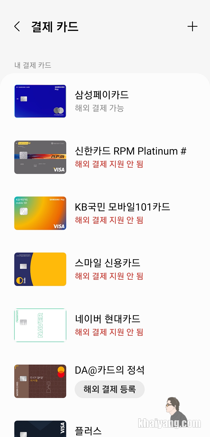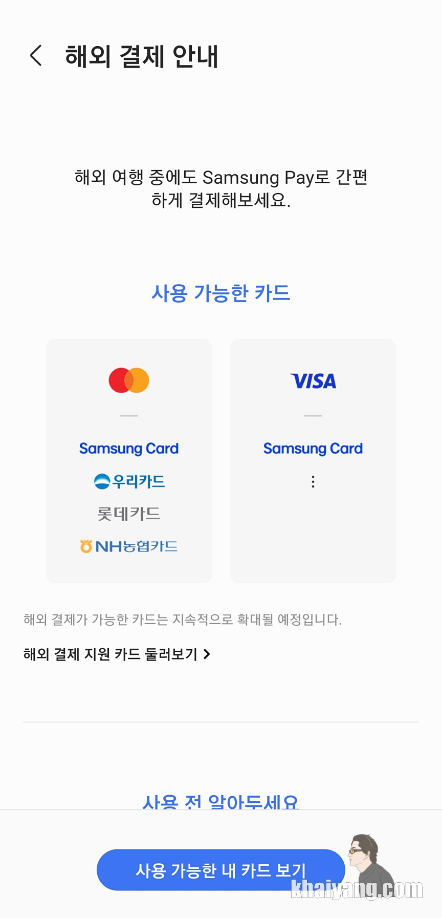 인터넷에서 해외결제가 안된다고 하시는 분들은 아마도 해외에서 사용가능한 신용카드가 없기 때문일 겁니다. 한국에서는 모든 신용카드로 삼성페이를 사용할 수 있지만 해외는 지원 일부 카드만 사용할 수 있습니다.