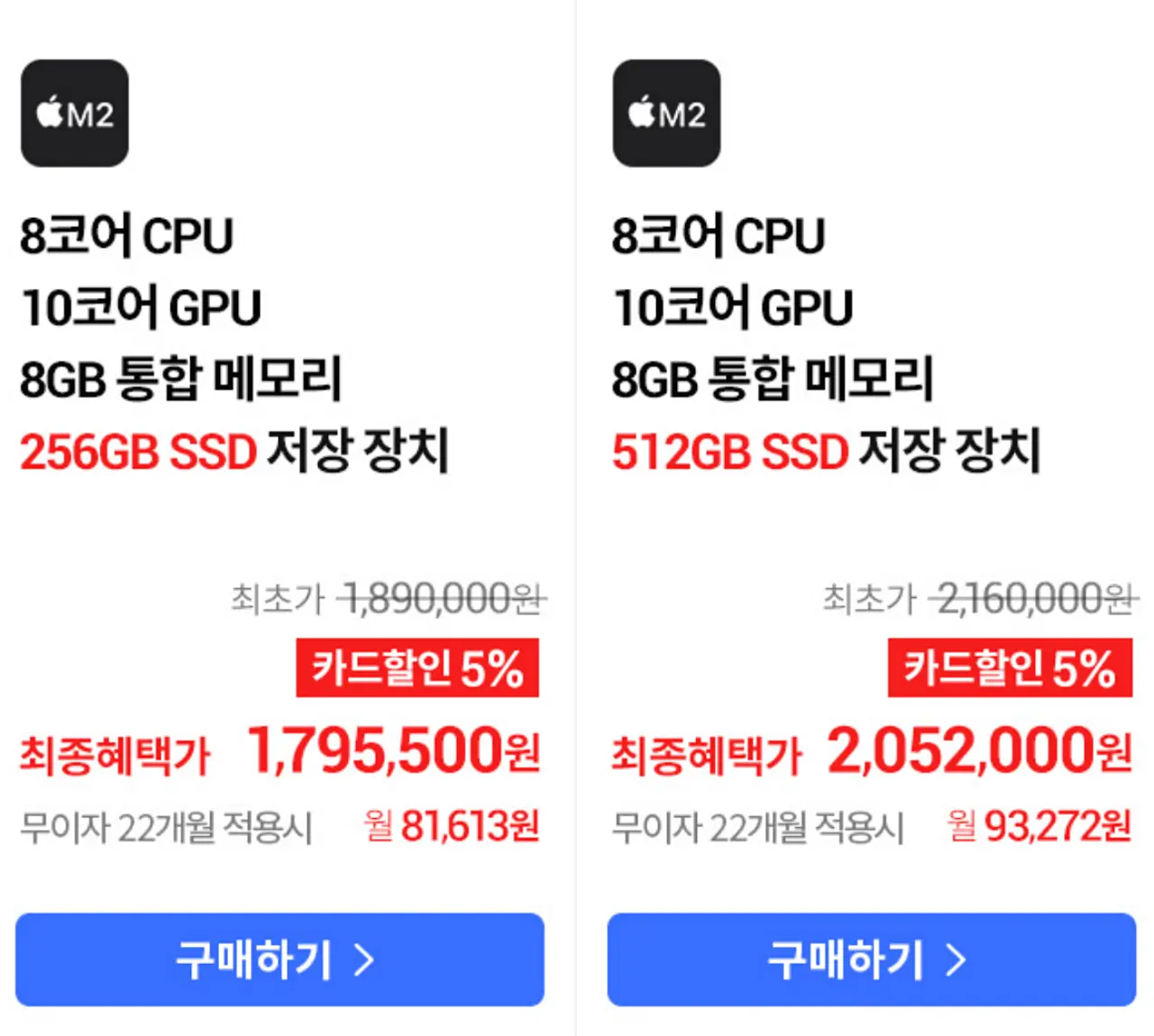 블로그, 워드프레스, 웹서핑을 주로 하고 초고화질 동영상 편집이 주가 아니라면 가성비 노트북으로는 맥북에어 M2 15인치 모델이 가장 적합하지 않을까 생각 됩니다.
