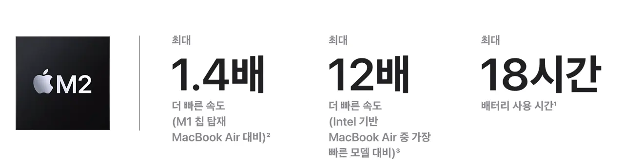 M1칩 대비 최대 1.4배, 인텔기반 맥북에어 대비 최대 12배 빠르고 배터리 사용시간은 최대 18시간으로 기존 노트북 대비 50% 더 길어졌습니다.