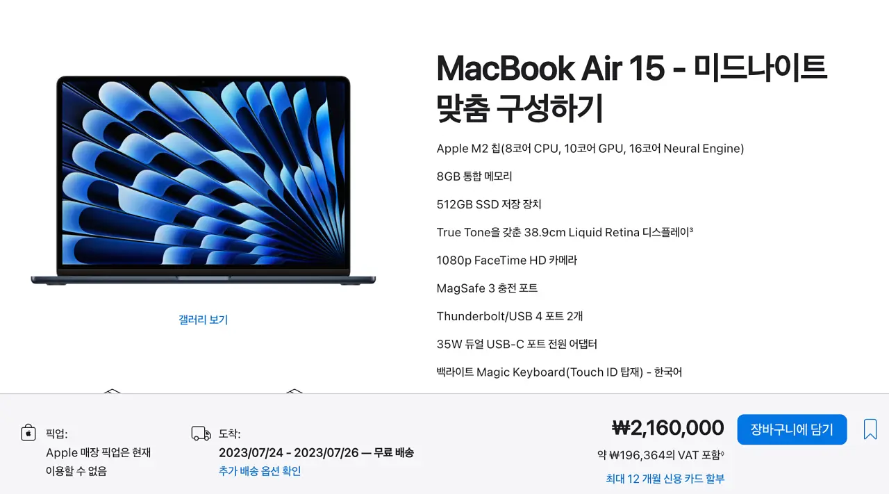 2023년형 맥북에어 15 인치 모델은 지금 사전예약이 진행 중 입니다. 애플 공홈에서도 진행 중인데 공홈에서 구매하는 경우에는 도착이 7월24일부터 26일 사이에 된다고 합니다.