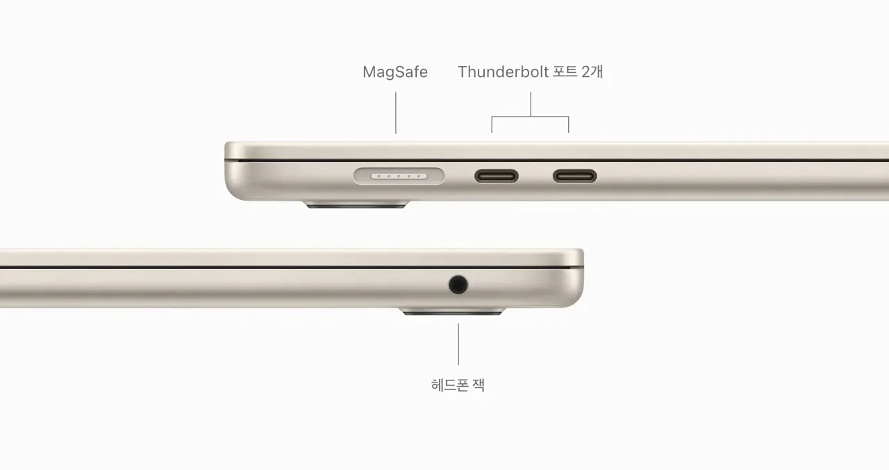 측면을 보면 안전하고 편리한 맥세이프, 썬더볼트 2개, 3.5mm 헤드폰 잭 포트로 구성되어 있습니다.