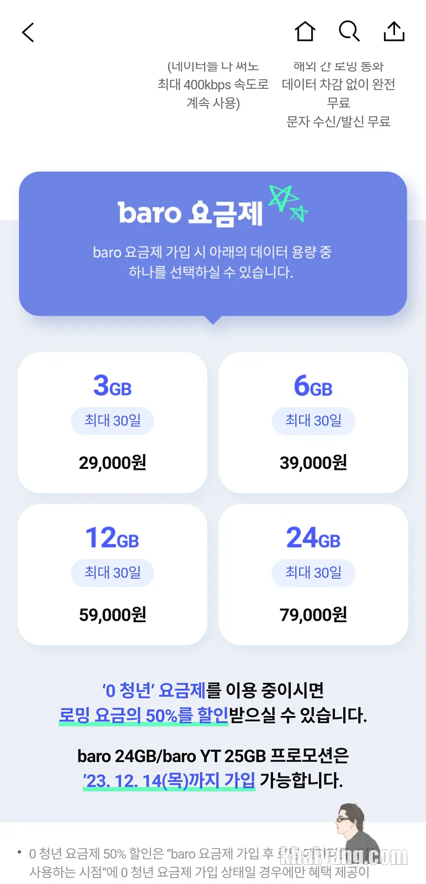 SKT 바로 로밍: 3GB/30일/29,000원, 6GB/30일/39900원, 12GB/30일/59,000원, 24GB/30일/79,000원