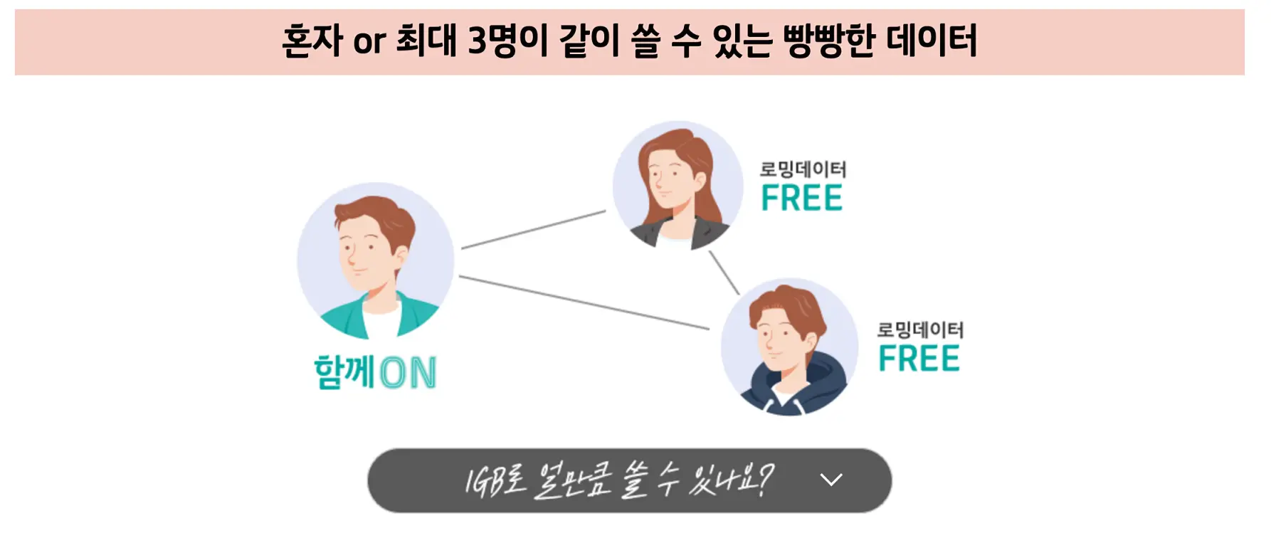 '데이터 함께 ON' 상품은 가입자 1명이 요금을 부담하면 본인 포함 최대 3명까지 추가요금을 지불하지 않고 데이터를 나눠쓸 수 있습니다.