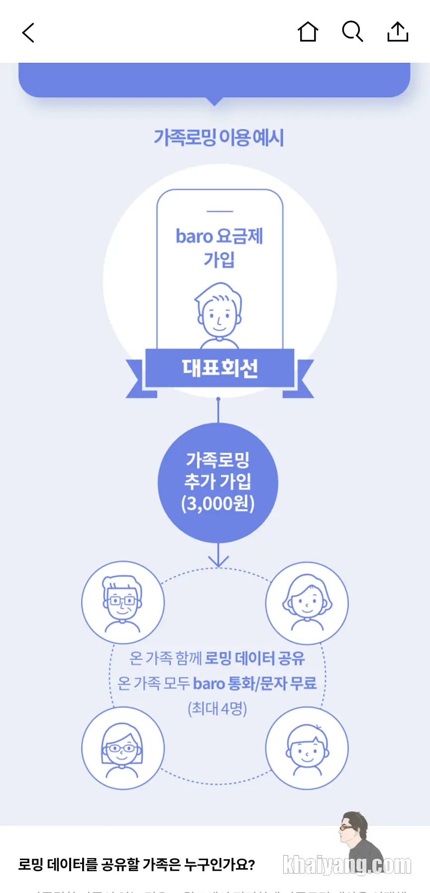 ‘가족로밍’은 바로 요금제에 가입한 가족대표 1명이 3,000원만 추가하면 모든 가족(대표 포함 최대 5명)이 로밍 데이터를 함께 사용하는 서비스 입니다.