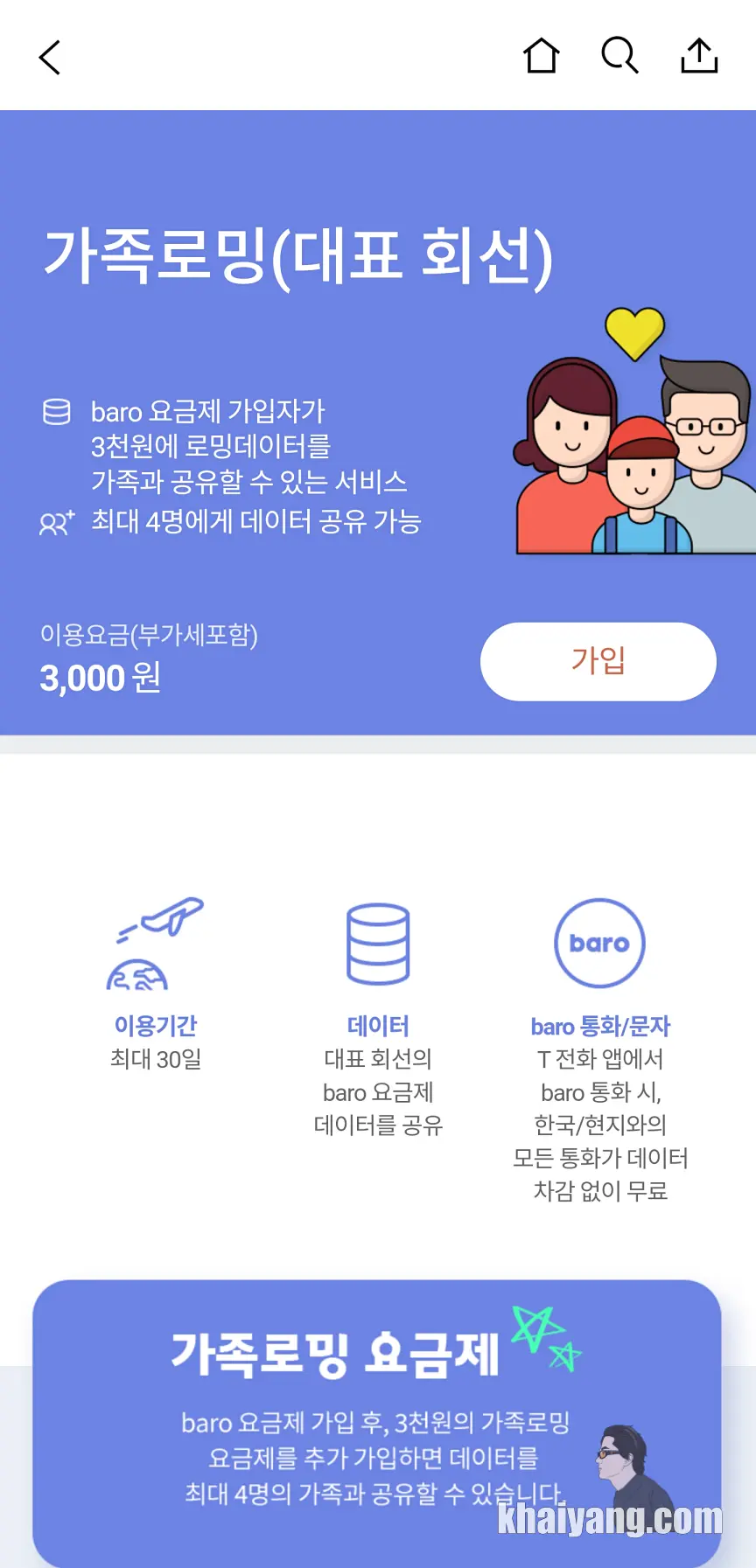예를 들어서, 3인 가족의 경우 한 명이 대표로 6GB 상품과 가족로밍을 4만2,000원(6GB 상품 3만9,000원 + 가족로밍 3,000원)에 가입 시 가족 3명이 30일간 6GB의 데이터를 나눠 쓸 수 있습니다.