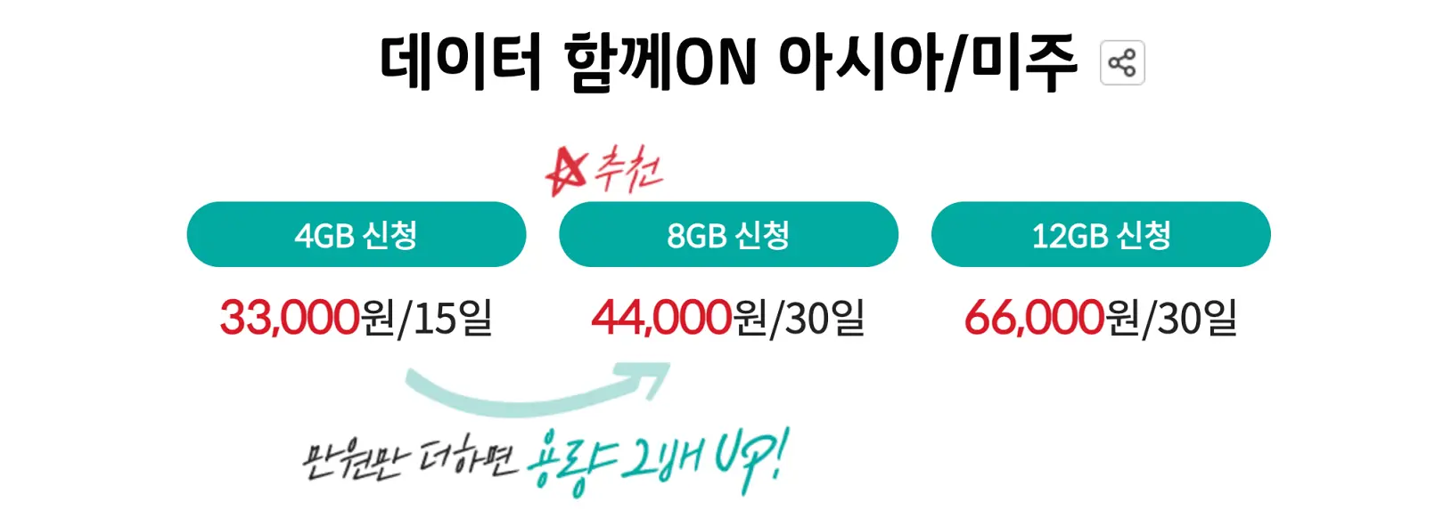 데이터 함께 ON 상품은 '4GB/33,000원/15일, 8GB/44,000원/30일, 12GB/66,000원/30일' 이렇게 3가지로 구성되어 있습니다. SKT 바로 로밍 보다는 상품 구성이 1개 부족하네요.