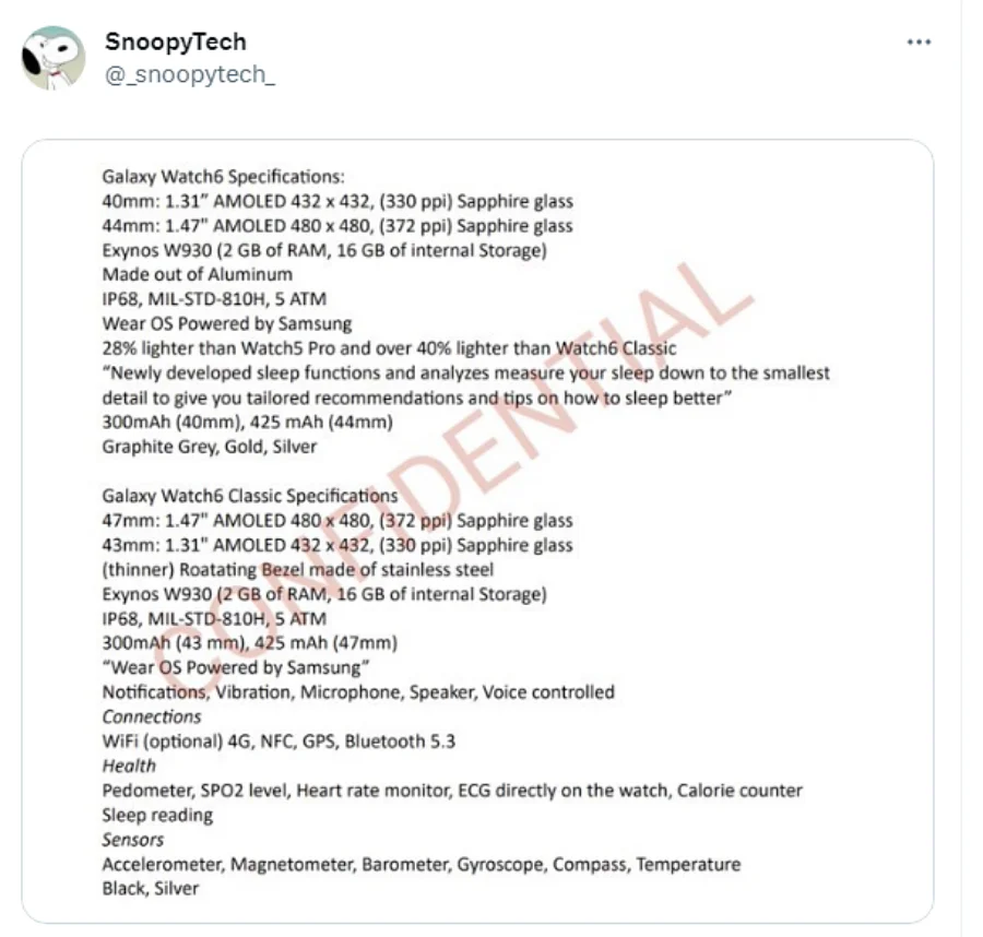 이번에 나올 신형 워치6 같은 경우 이전 모델 대비 화면의 크기가 커질 것 같습니다. 웹상에서 유출된 워치6 스펙 세부 사양을 보면 자세한 크기에 대한 것을 확인할 수 있습니다.