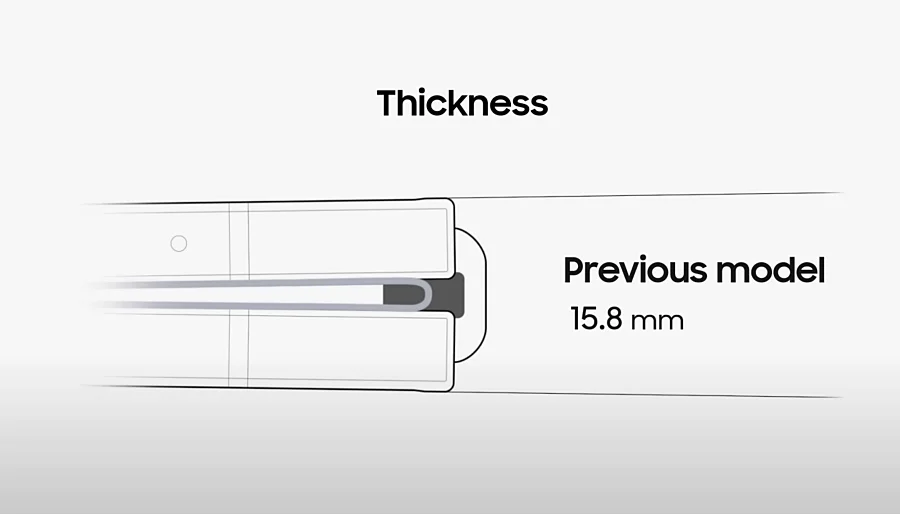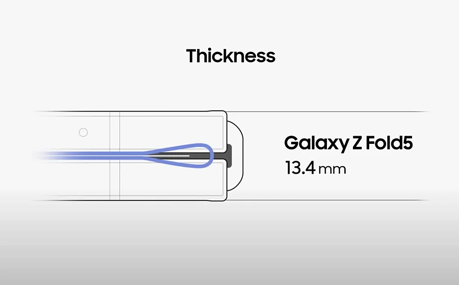 틈을 지우다 보니 접었을때의 두께도 줄일 수 있었는데 기존 폴드4 두께가 15.8mm 인 반면에 폴드5는 13.4mm 에 불과 합니다.