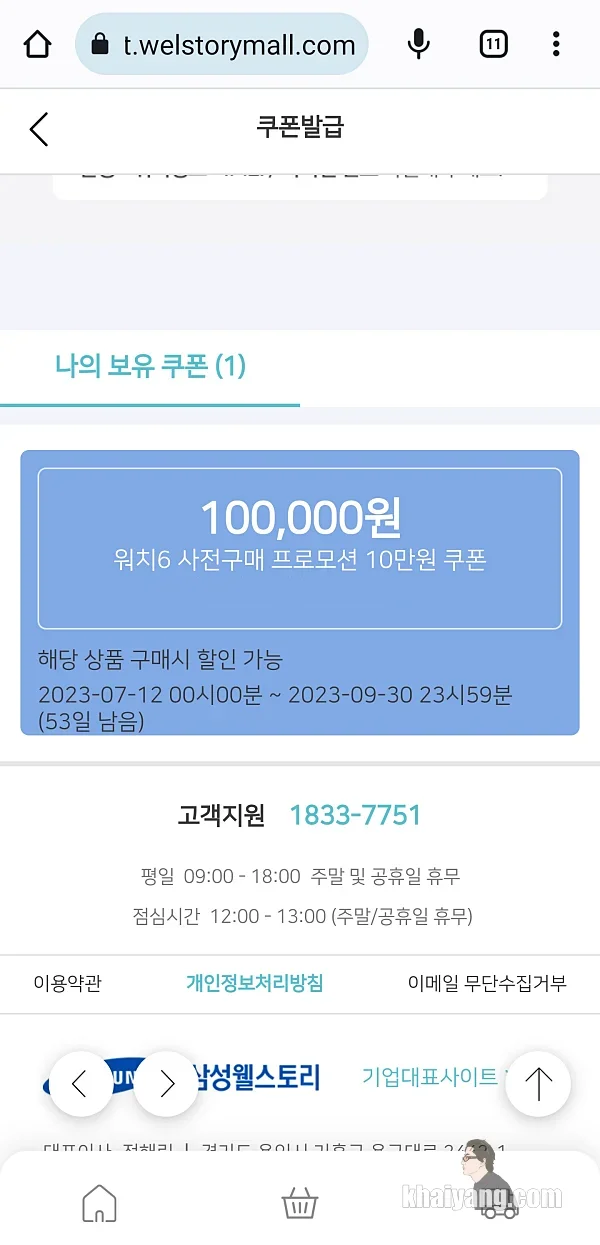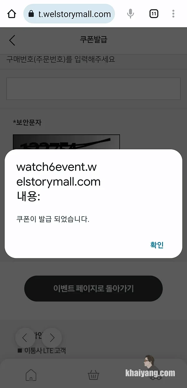등록 버튼을 누르면 이제 쿠폰이 발급 되었다는 팝업창을 볼 수 있습니다.