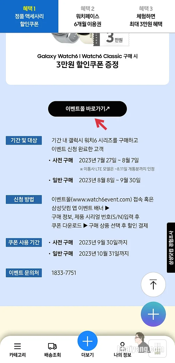 사전예약 기간이 끝나고 구매하신 분들은 3만원 할인 쿠폰을 받을 수 있습니다. 지금 부터 갤럭시워치6 사전/일반 구매 혜택 신청하는 방법에 대해서 살펴 보도록 하겠습니다.