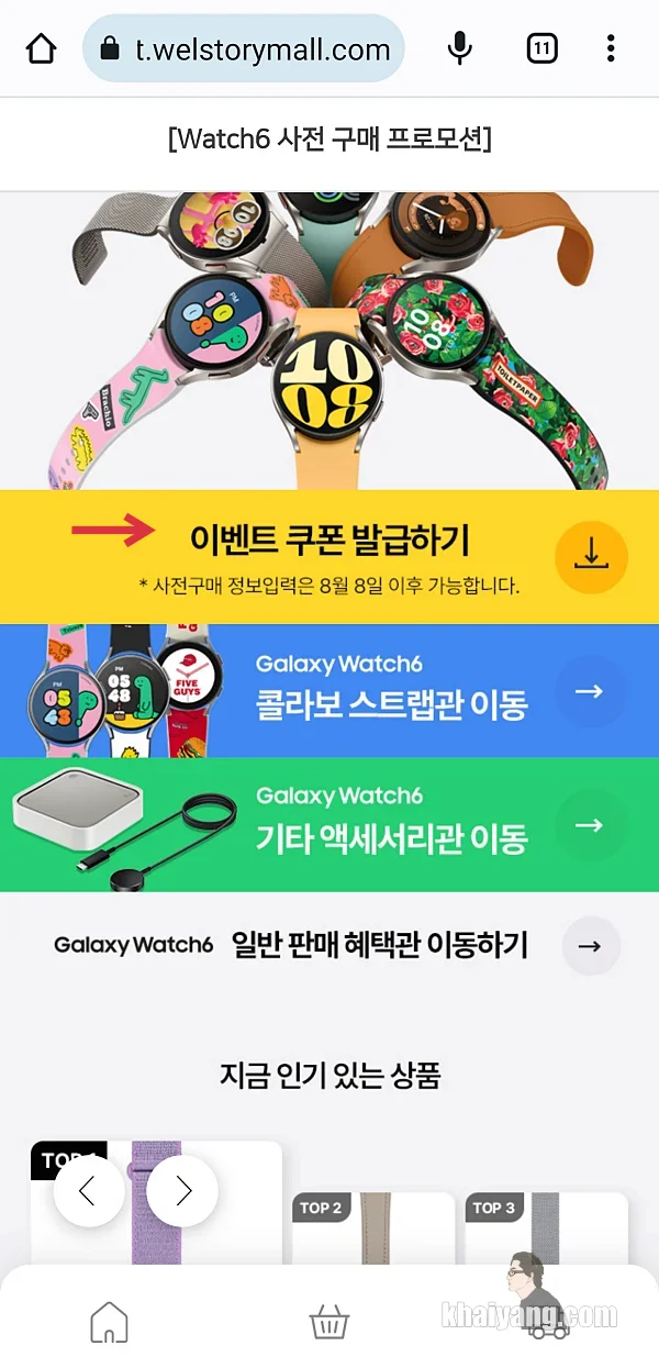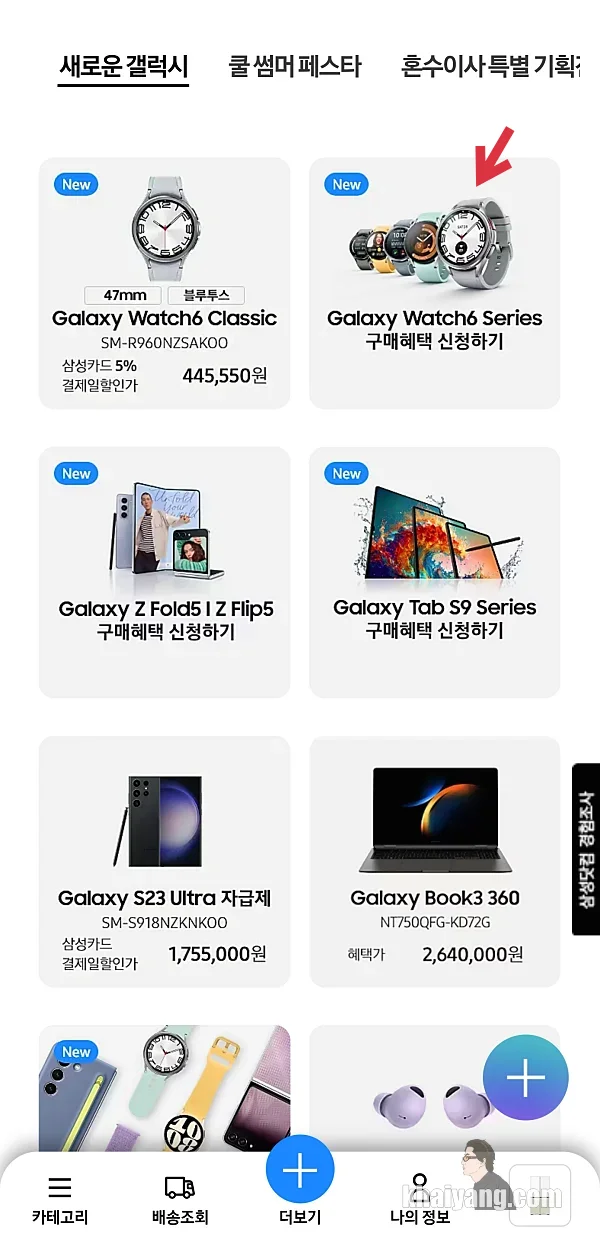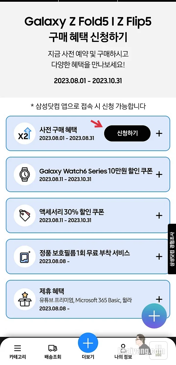 갤럭시워치6 사전구매 혜택 신청은 삼성 멤버스 앱이 아닌 삼성닷컴 앱 또는 삼성닷컴 모바일에서 진행 하실 수 있습니다. 저는 앱에서 신청을 했습니다.