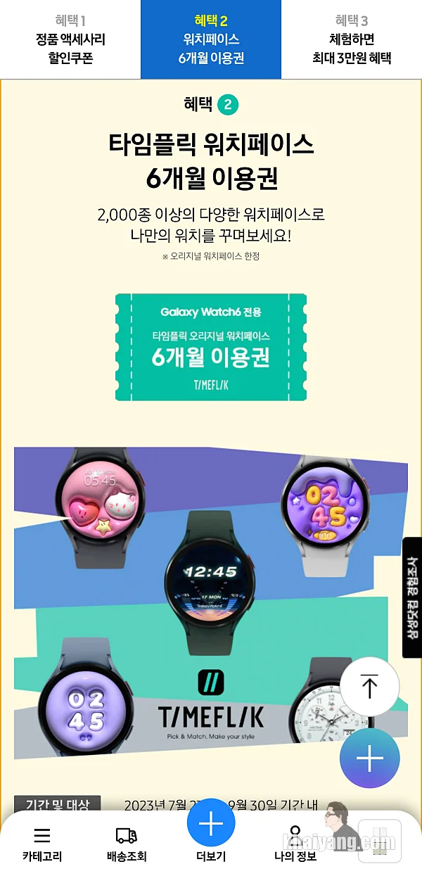 이 외에도 타임플릭 오리지널 워치페이스 6개월 이용권도 있고 체험하면 최대 3만원 주는 혜택도 있으니 내용을 잘 살펴보고 이용하시기 바랍니다.