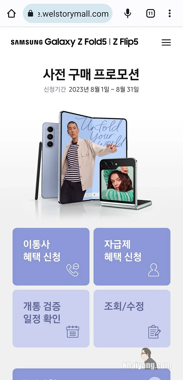 앱 또는 사이트에 들어 가시면 중간 부분 쯤에 갤럭시워치6 시리즈 구매 혜택 신청, 갤럭시Z플립5 폴드5, 갤럭시탭S9 시리즈 구매 혜택 배너가 있는 것을 확인할 수 있습니다.