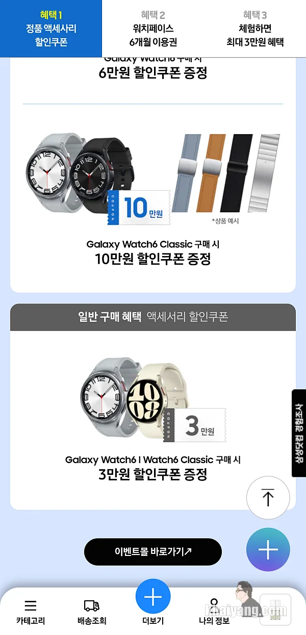 워치6 구매 혜택을 보면 총3개가 있는데 액세서리 할인쿠폰 + 워치페이스 6개월 이용권 + 체험하면 최대 3만원 받는 혜택이 있습니다.