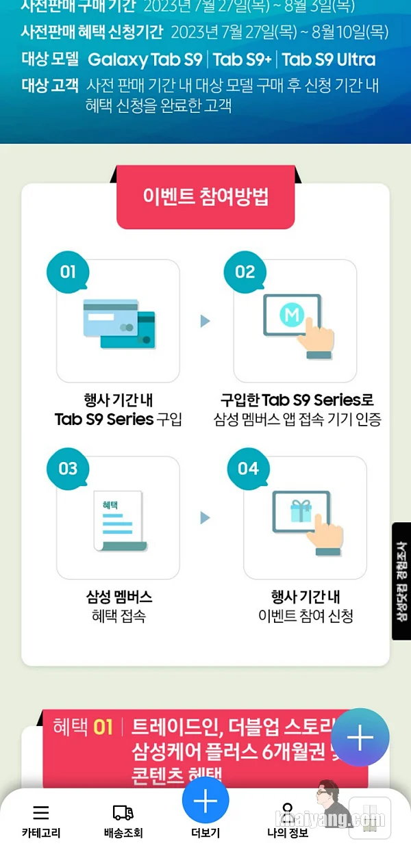 갤럭시탭 S9 시리즈 사전판매 프로모션도 진행 중인데 이건 삼성닷컴 앱이 아닌 삼성멤버스에서 접속해서 이벤트에 참여 할 수 있습니다.
