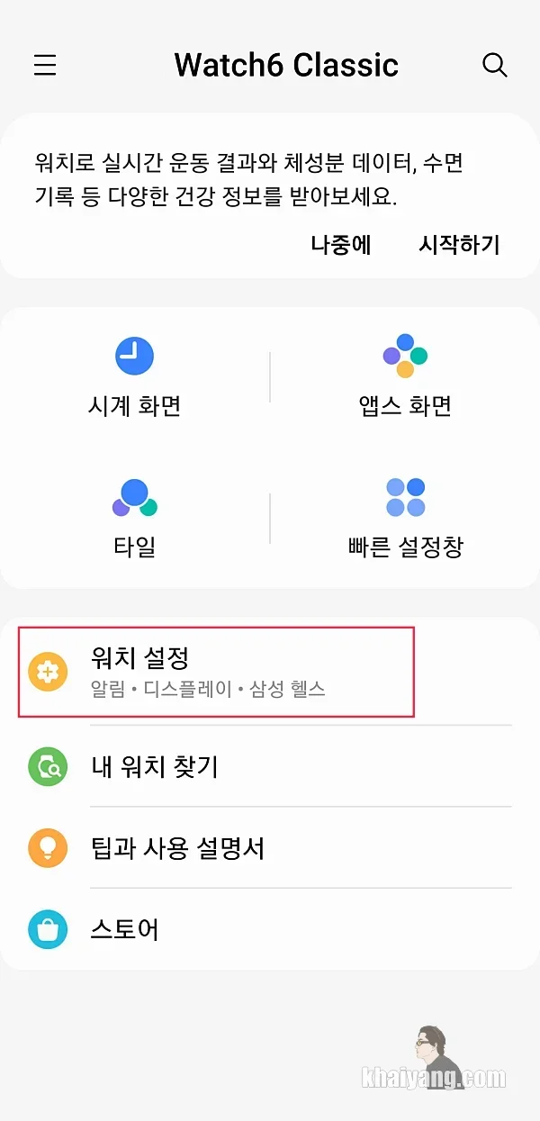 스마트폰에 있는 갤럭시웨어러블 앱을 여신 후에 워치 설정을 터치 합니다.